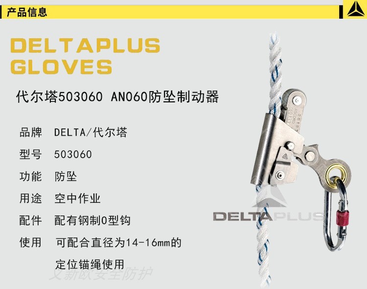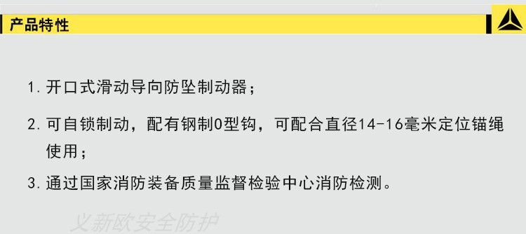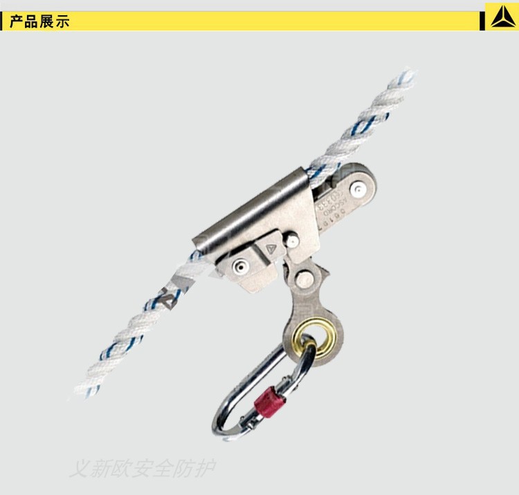 开口式滑动导向防坠制动器,带有1个钢制O型钩AM002,能量吸收器和坠落指示器,可配合直径为14-16mm的定位锚 绳使用;