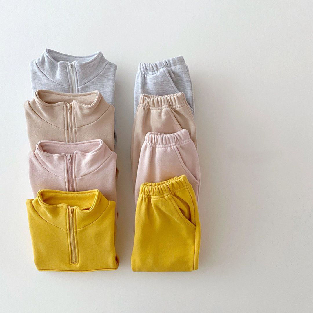 봄, 가을용 한국 스타일 아동용 단색 캐주얼 트렌디 면 스웨트셔츠 바지 세트, 지퍼 칼라, 해외 인기 상품