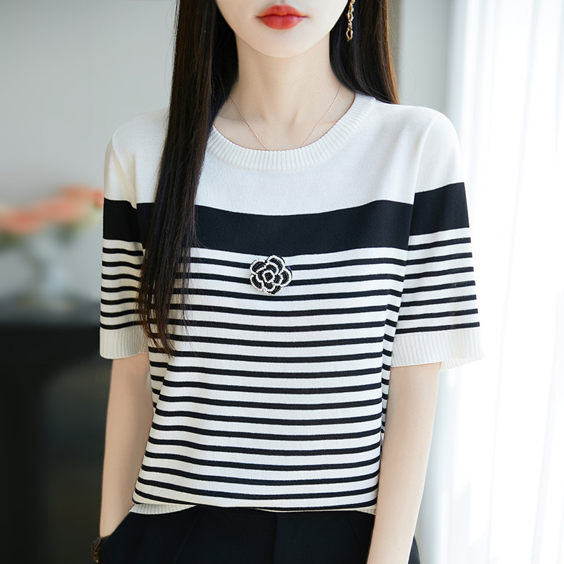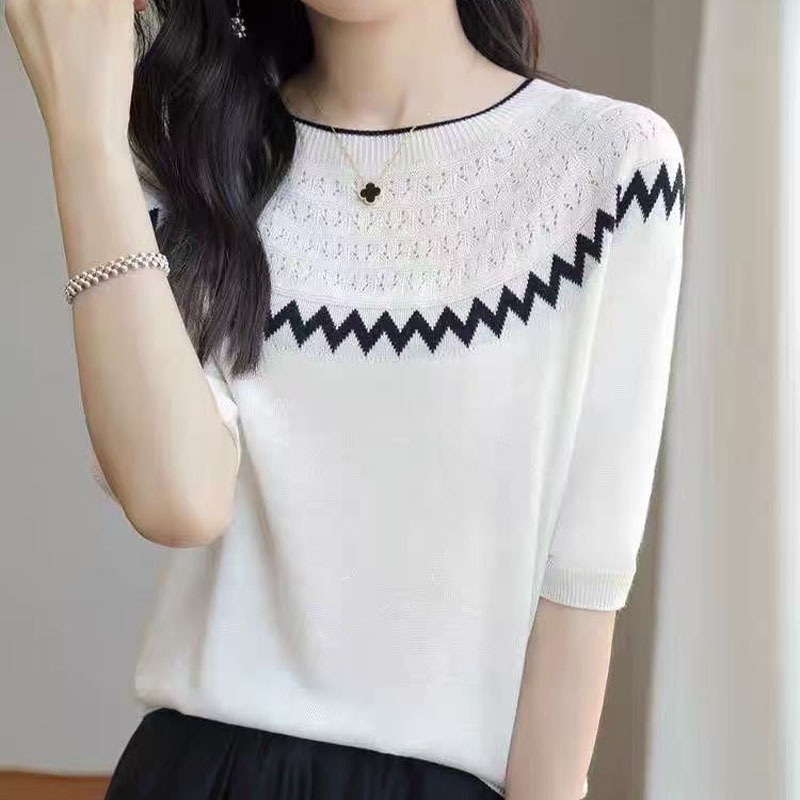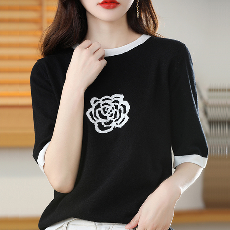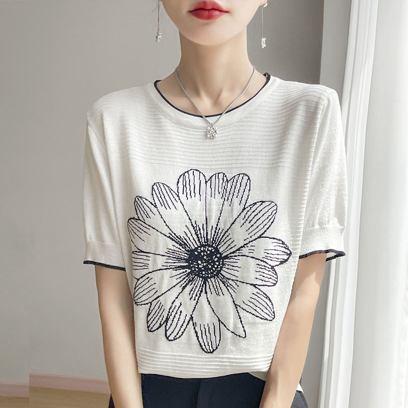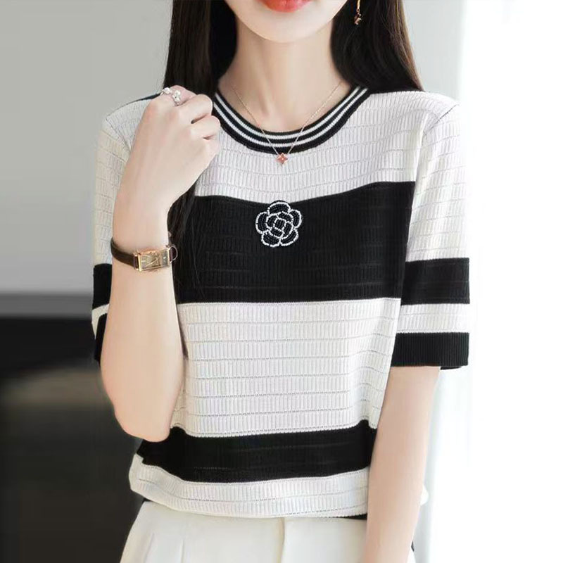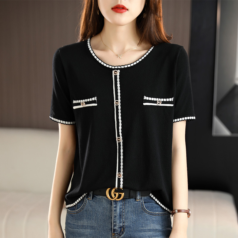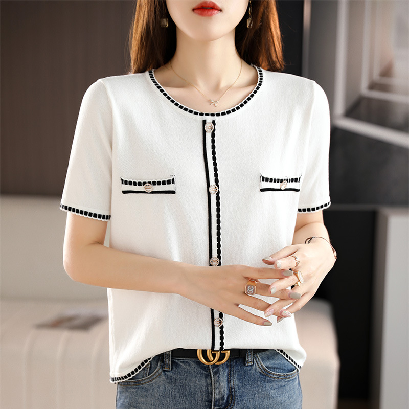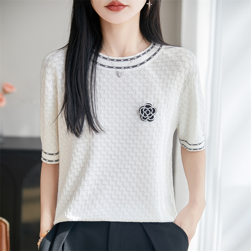 夏女装款新款曲珠冰麻丝短袖女针织衫花朵T恤女圆领背心外贸批发 夏短袖女冰丝亚麻丝光棉针织短袖女T恤女圆领黑白撞色外贸批代发 夏季女装新款曲珠冰麻丝短袖女针织衫撞色T恤女圆领背心外贸批发 夏短袖女冰丝亚麻丝光棉针织短袖女T恤女圆领小香风外贸批发代发