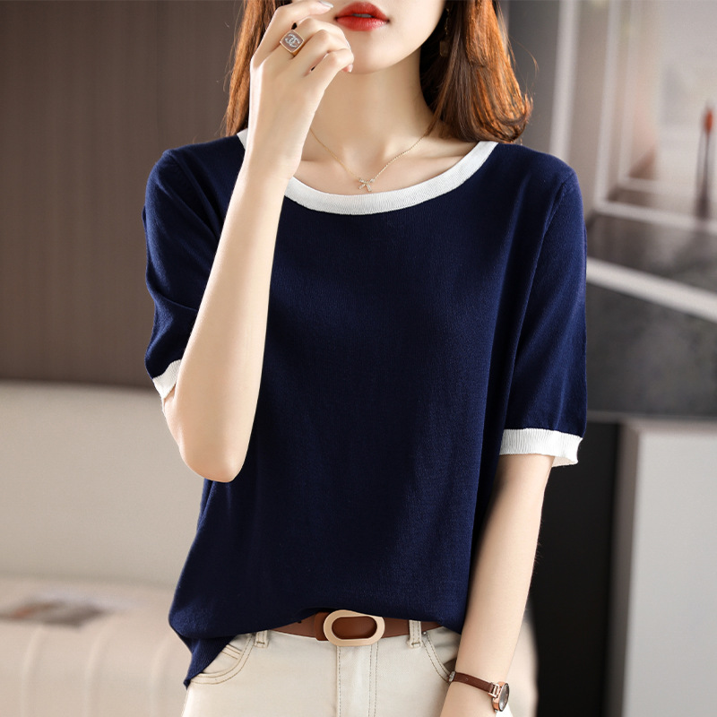 여름 반팔 여성용 아이스 실크 린넨 머서라이즈드 코튼 니트 반팔 여성 티셔츠 여성용 라운드 넥 소형 향기로운 바람 대외 무역 도매 세대 헤어스토어 가기