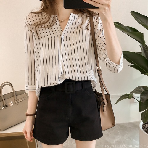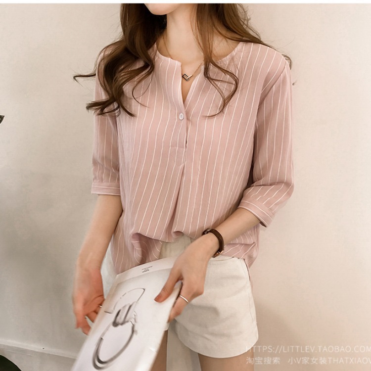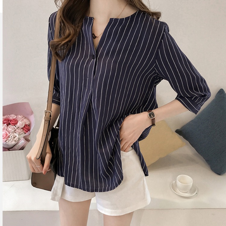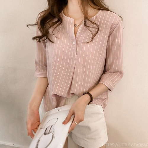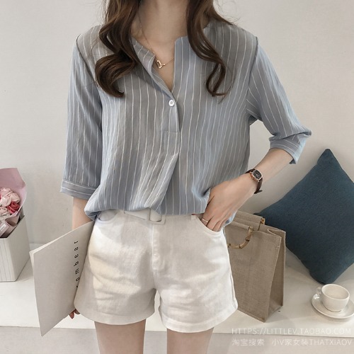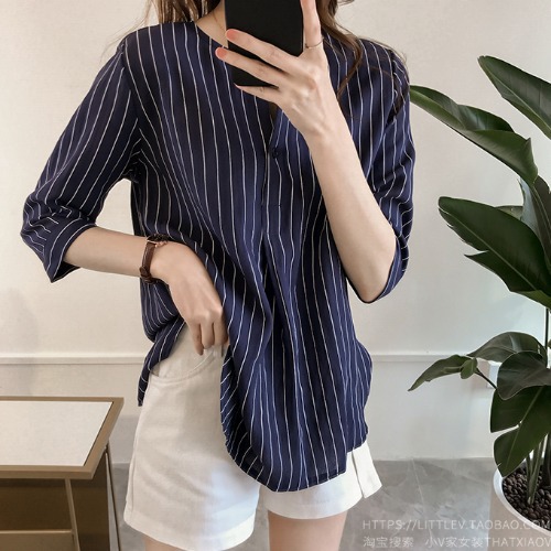 라운드 칼라 스트라이프 셔츠 작은 여자 2024 여름 새로운 한국 스타일 7 점 슬리브 탑 느슨한 캐주얼 셔츠스토어 가기