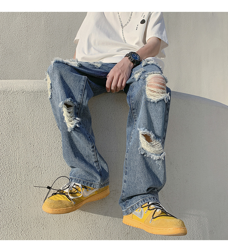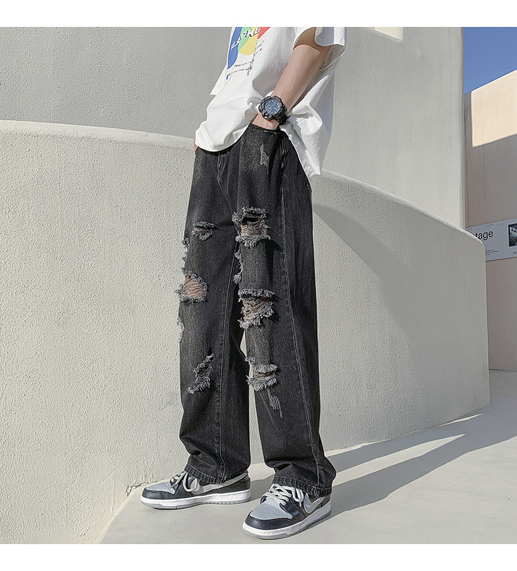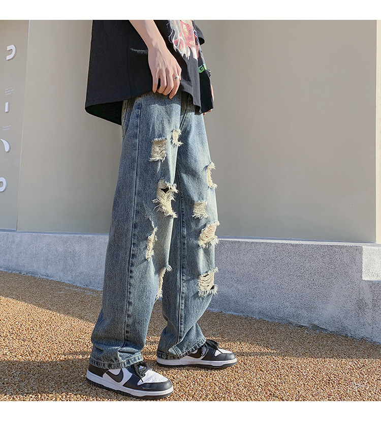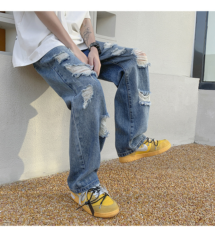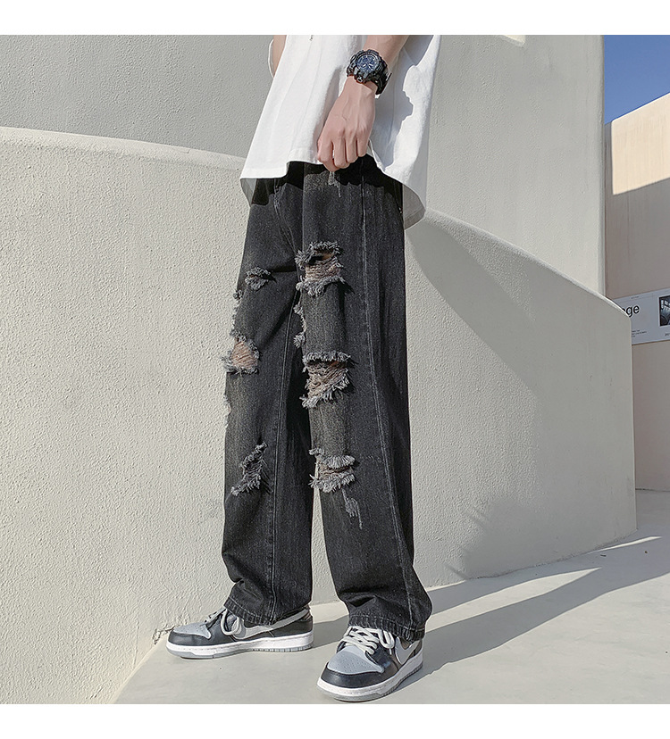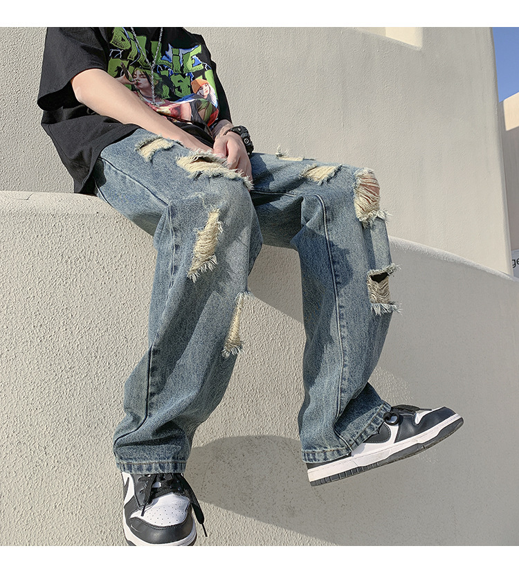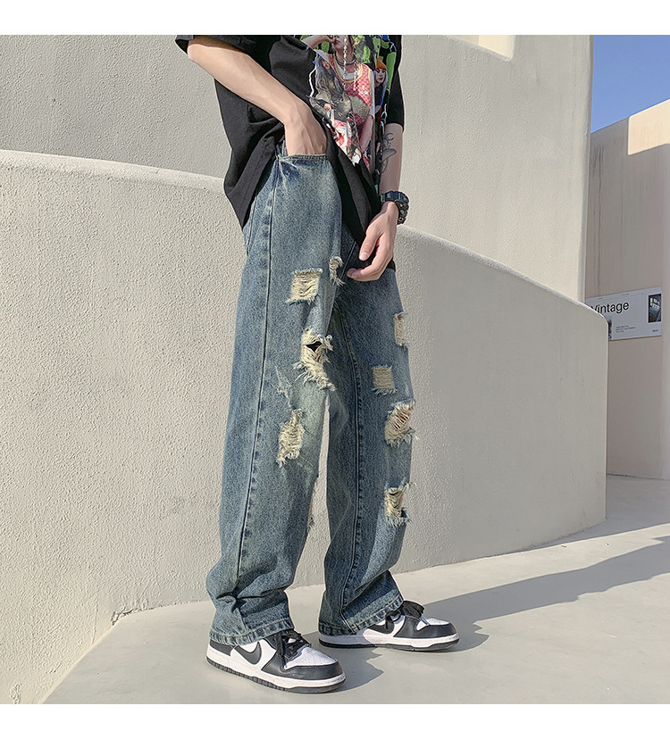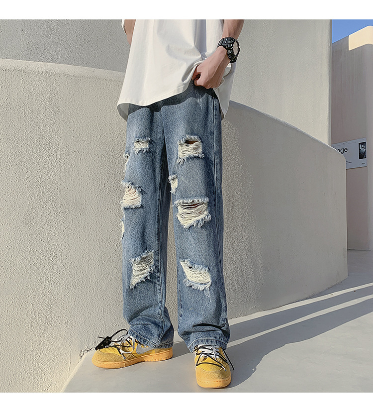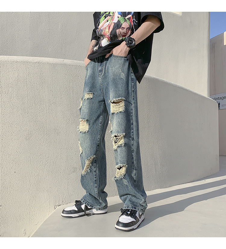 찢어진 청바지 남자의 여름 in 하이 스트리트 느슨한 거지 와이드 레그 팬츠 디자인 센스 틈새 트렌디 브랜드 스트레이트 팬츠스토어 가기