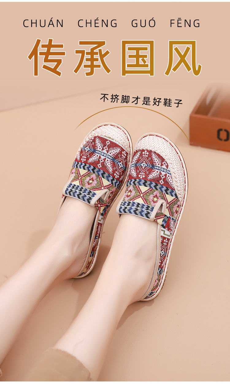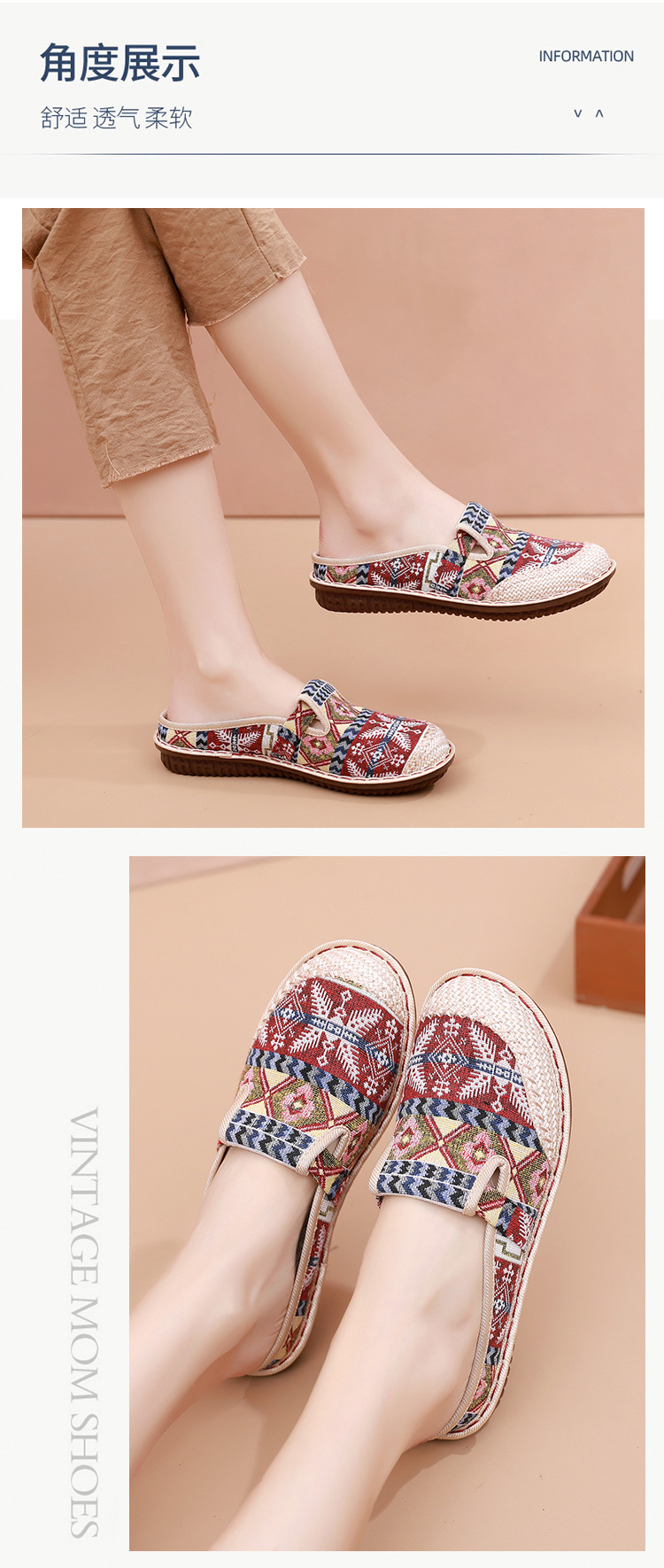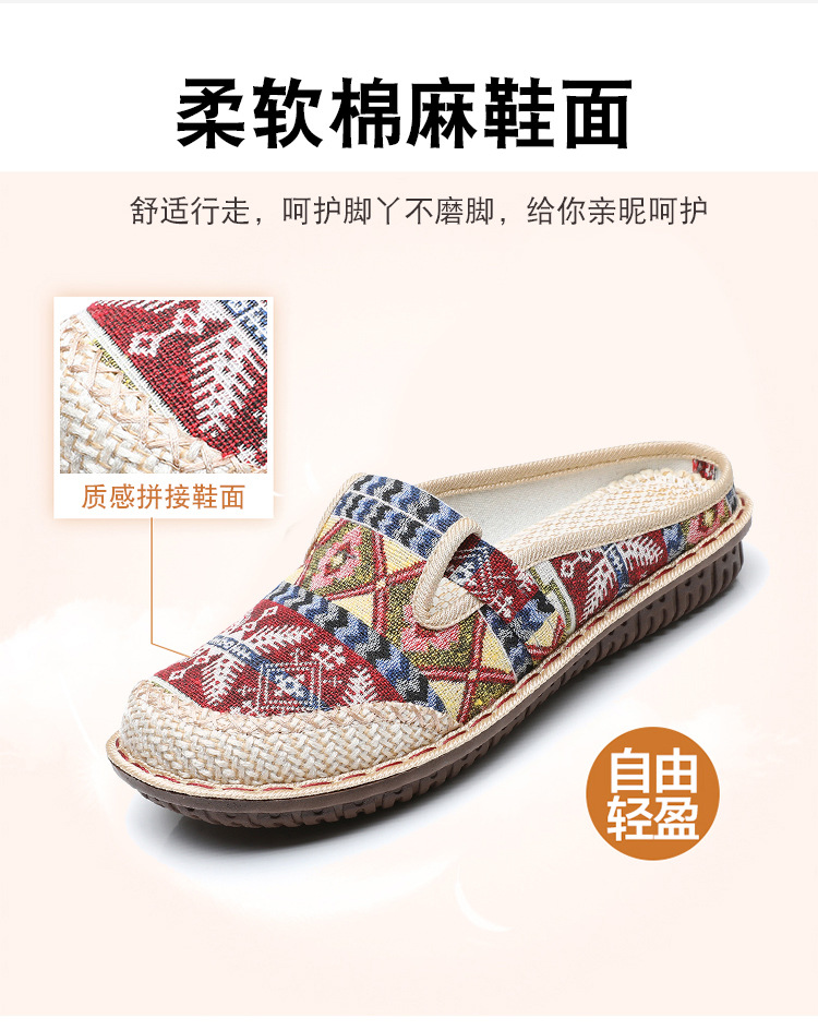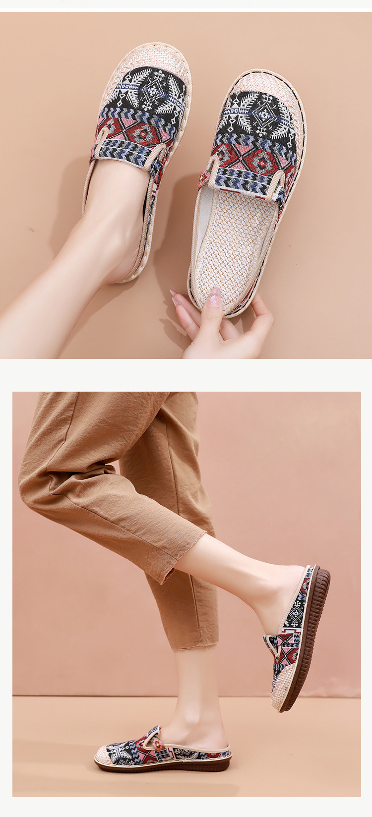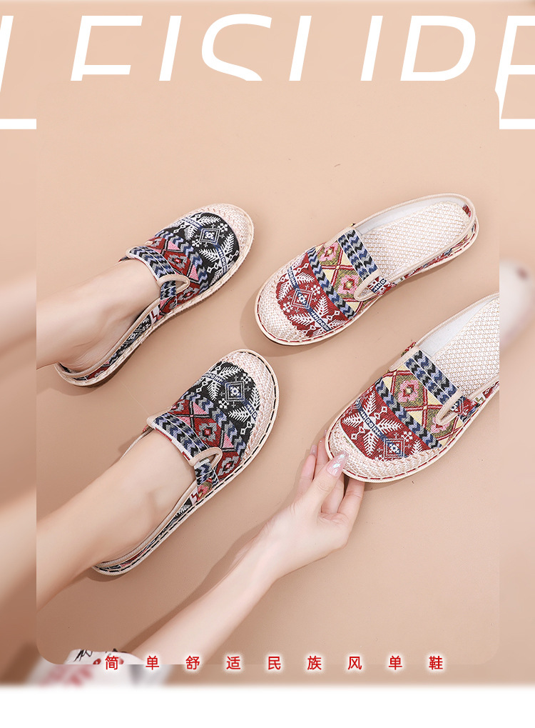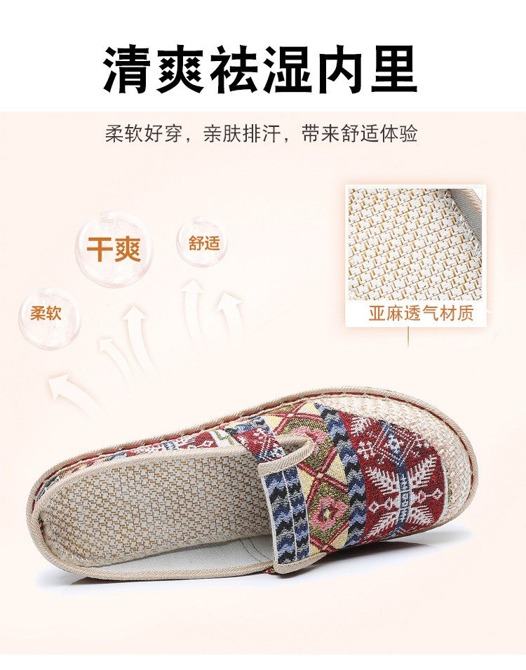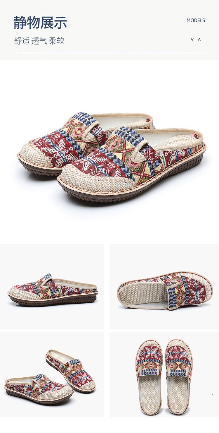 2024 새로운 여름 민족 스타일 린넨 복고풍 민족 스타일 신발 플랫 편안한 여성 슬리퍼 겉옷 천 신발