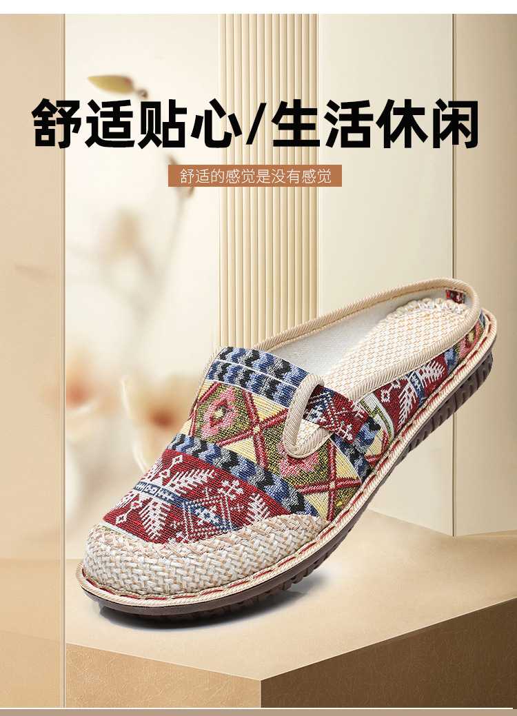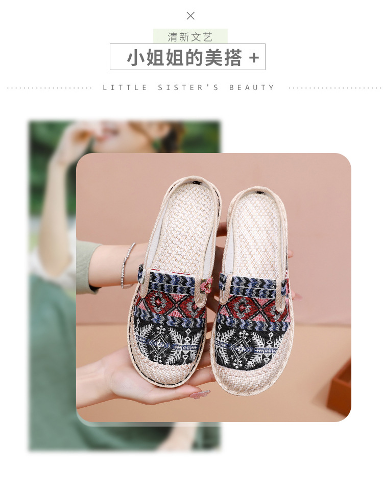 2024 새로운 여름 민족 스타일 린넨 복고풍 민족 스타일 신발 플랫 편안한 여성 슬리퍼 겉옷 천 신발스토어 가기