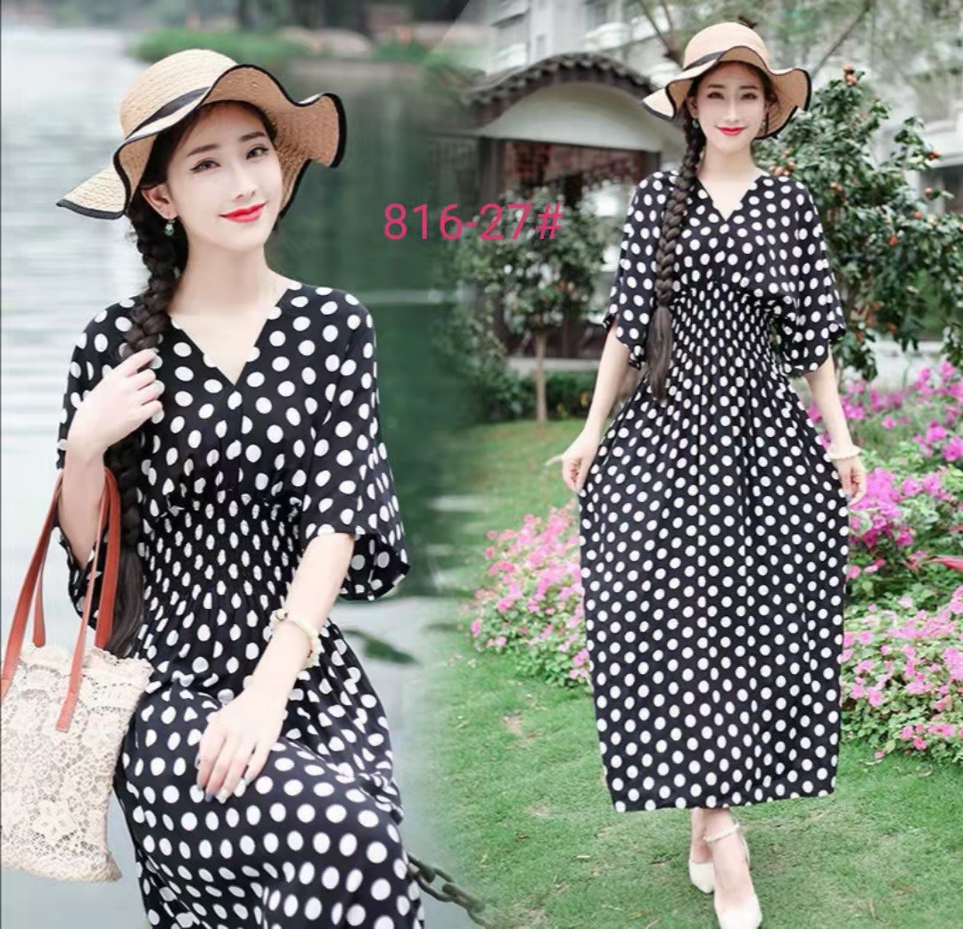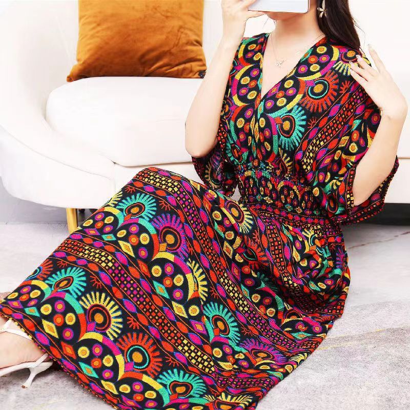 태국 민족풍 V넥 레이온 반팔 섬 휴양 원피스, 서솽반나 여행용 원피스, 여름