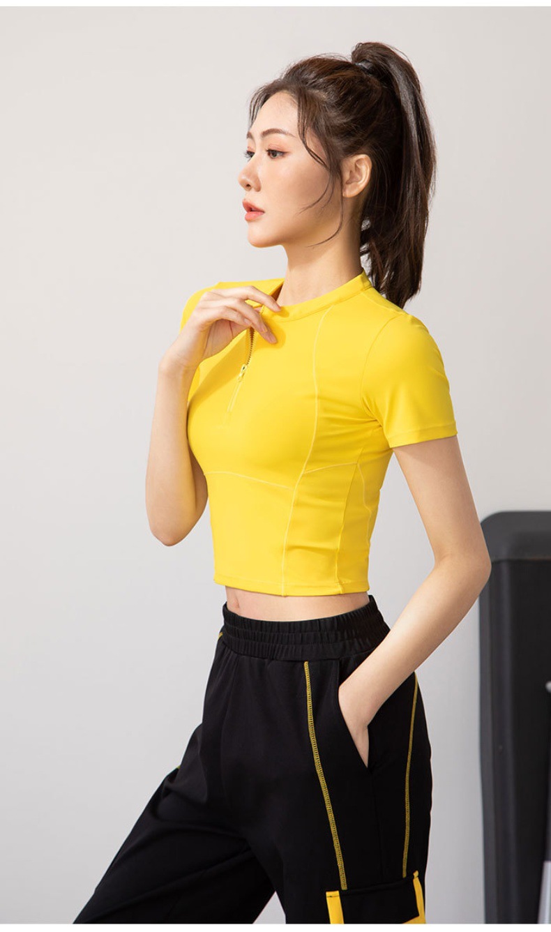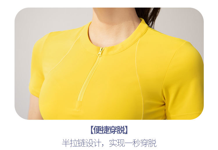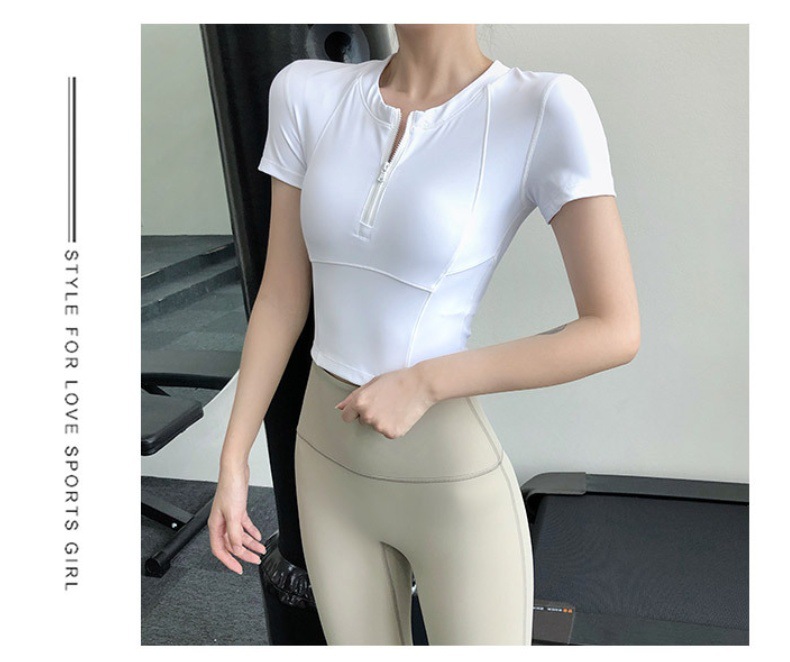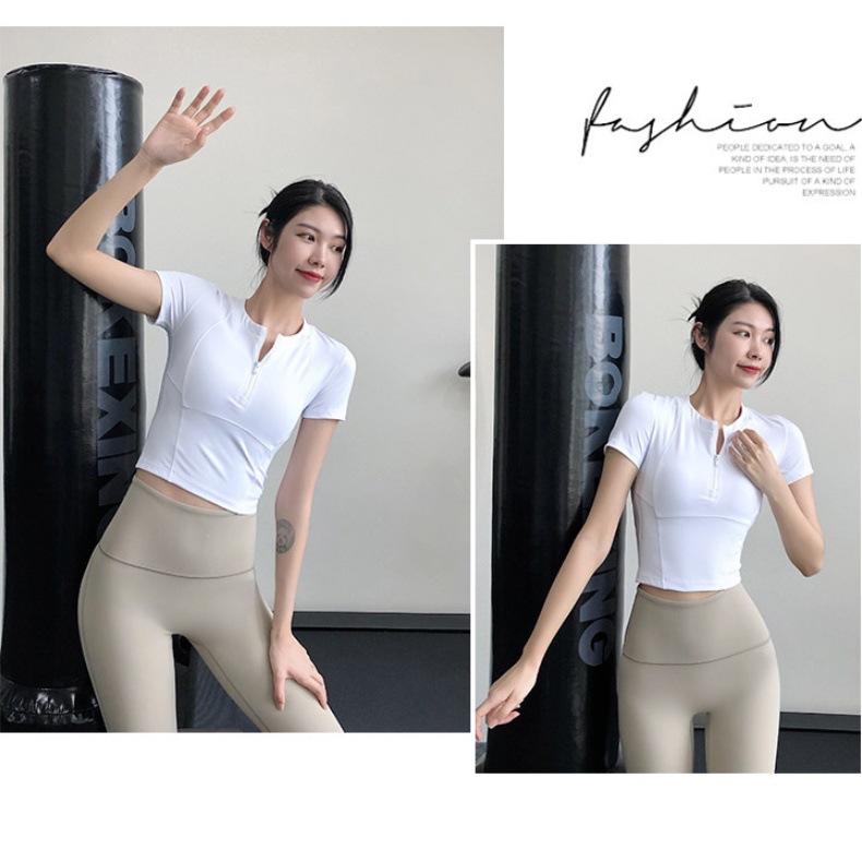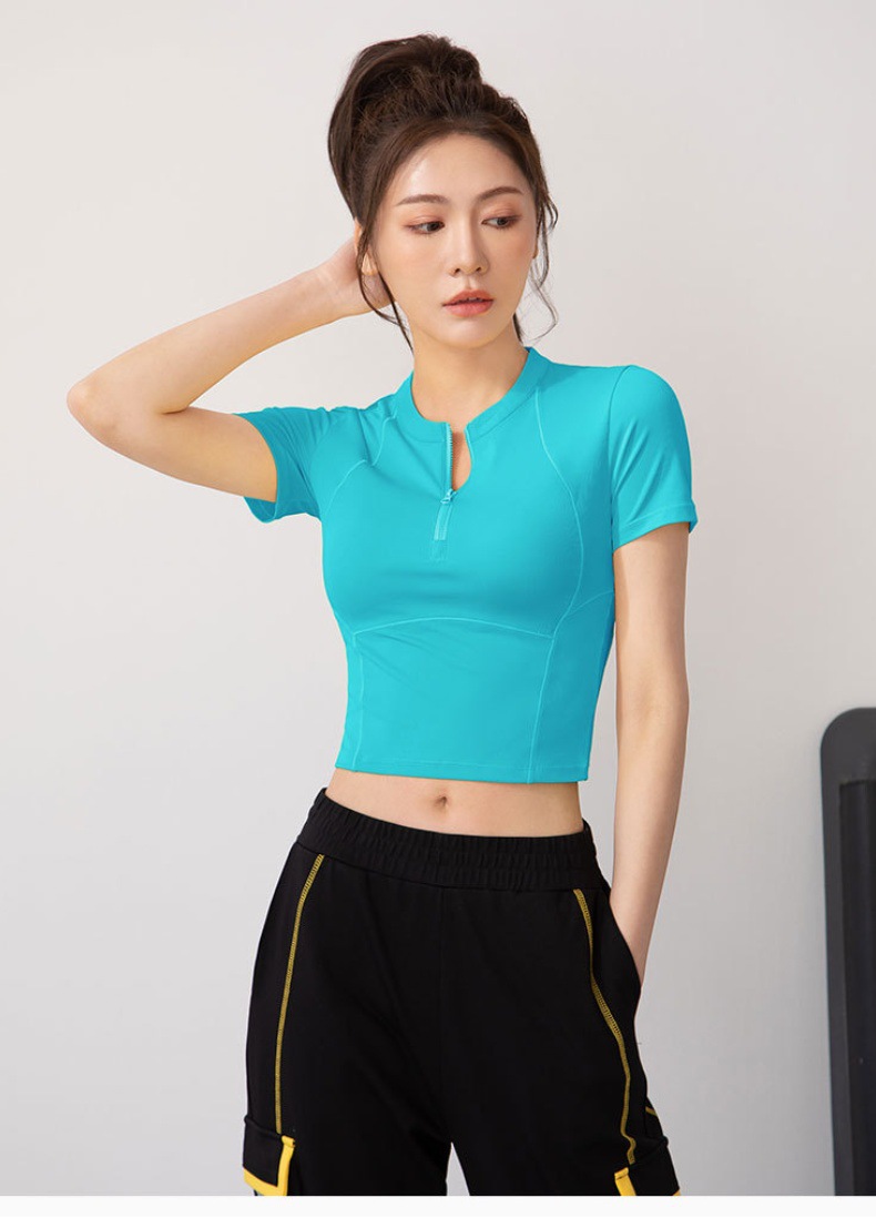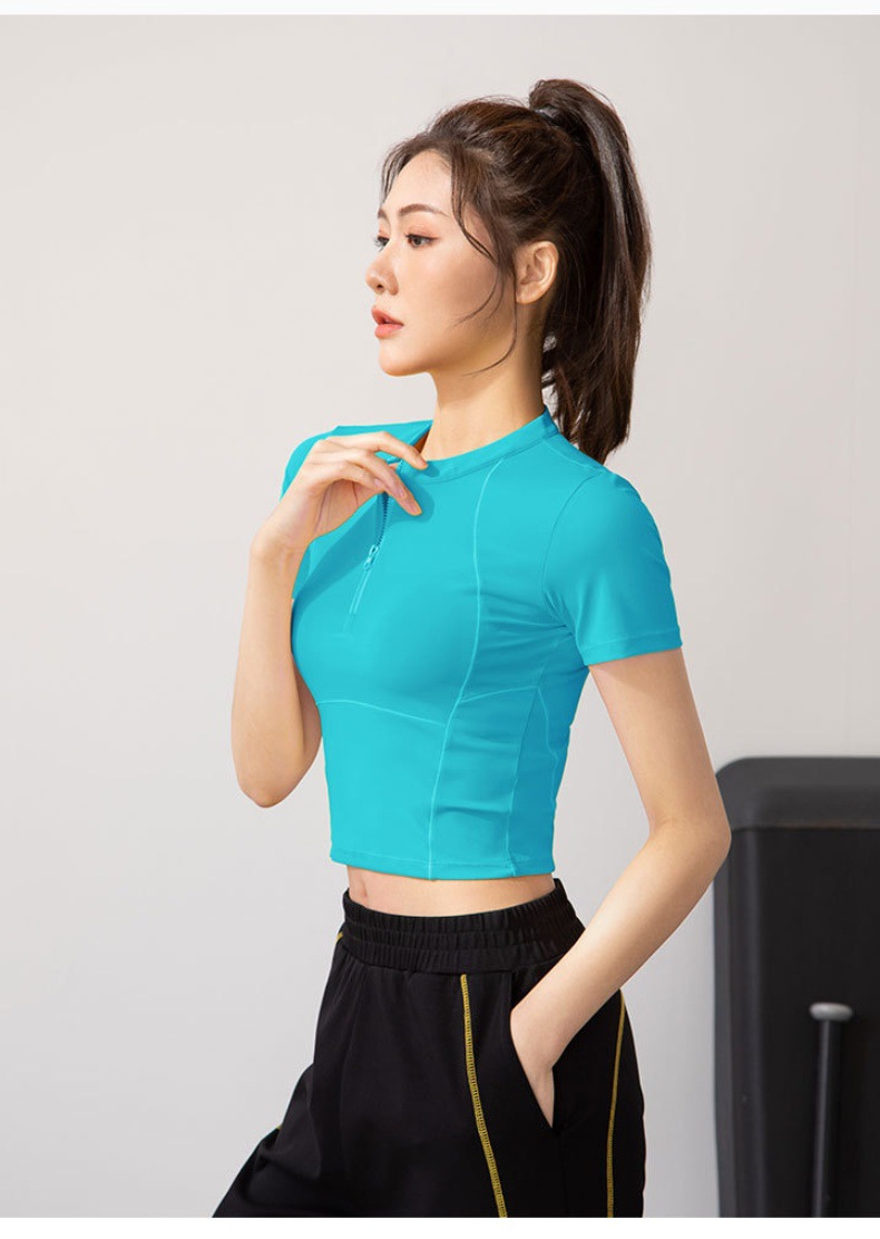 여름 얇은 하프 지퍼 피트니스 의류 여성용 달리기 속건 의류 스포츠 반팔 티셔츠 타이트 요가 탑스토어 가기
