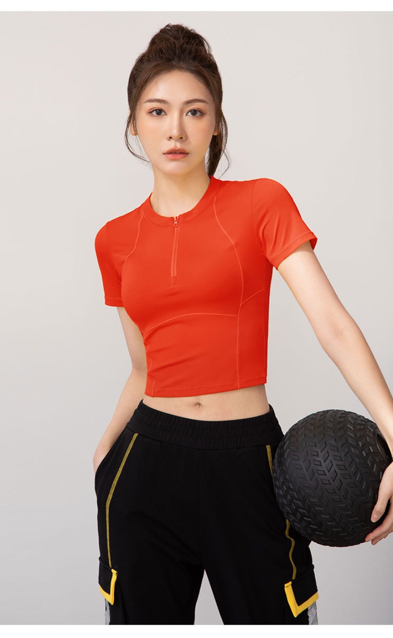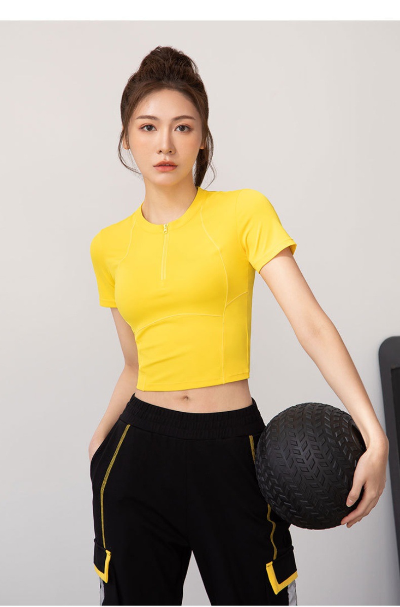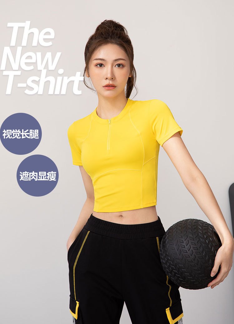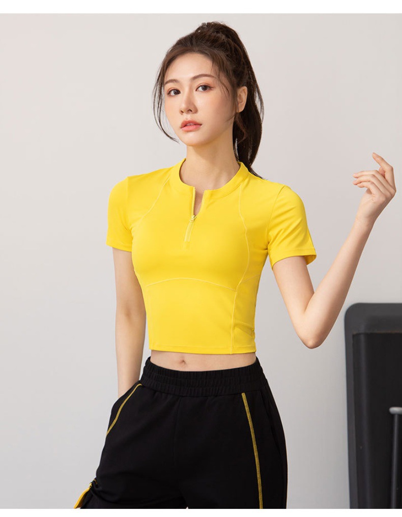 여름 얇은 하프 지퍼 피트니스 의류 여성용 달리기 속건 의류 스포츠 반팔 티셔츠 타이트 요가 탑