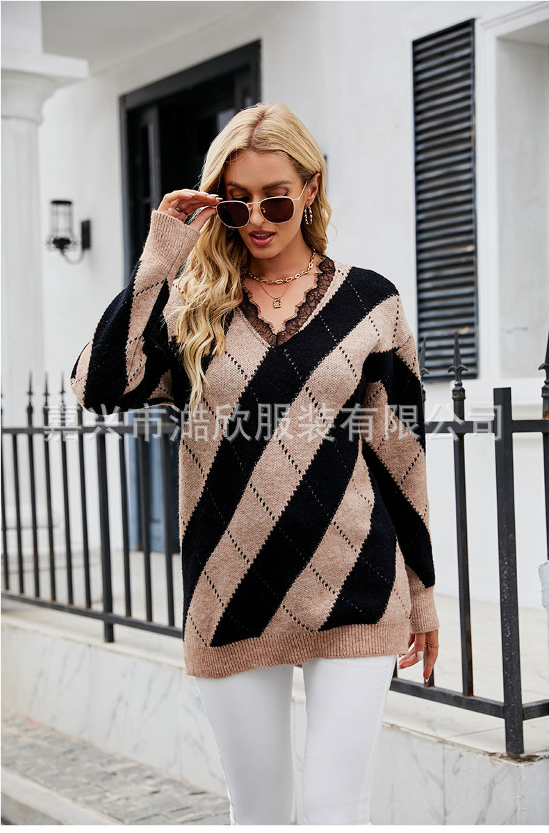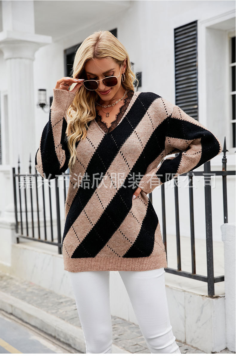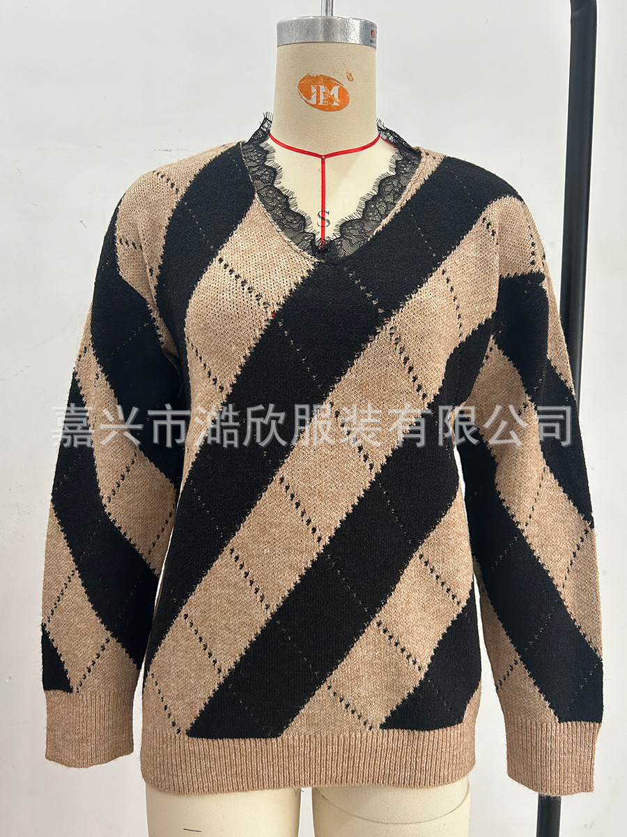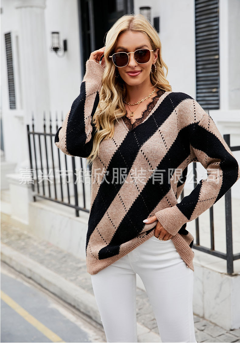 2023 가을과 겨울 새로운 유럽과 미국 대외 무역 여성용 컬러 매칭 레이스 V-넥 캐주얼 스웨터 크로스 보더 풀오버 스웨터스토어 가기