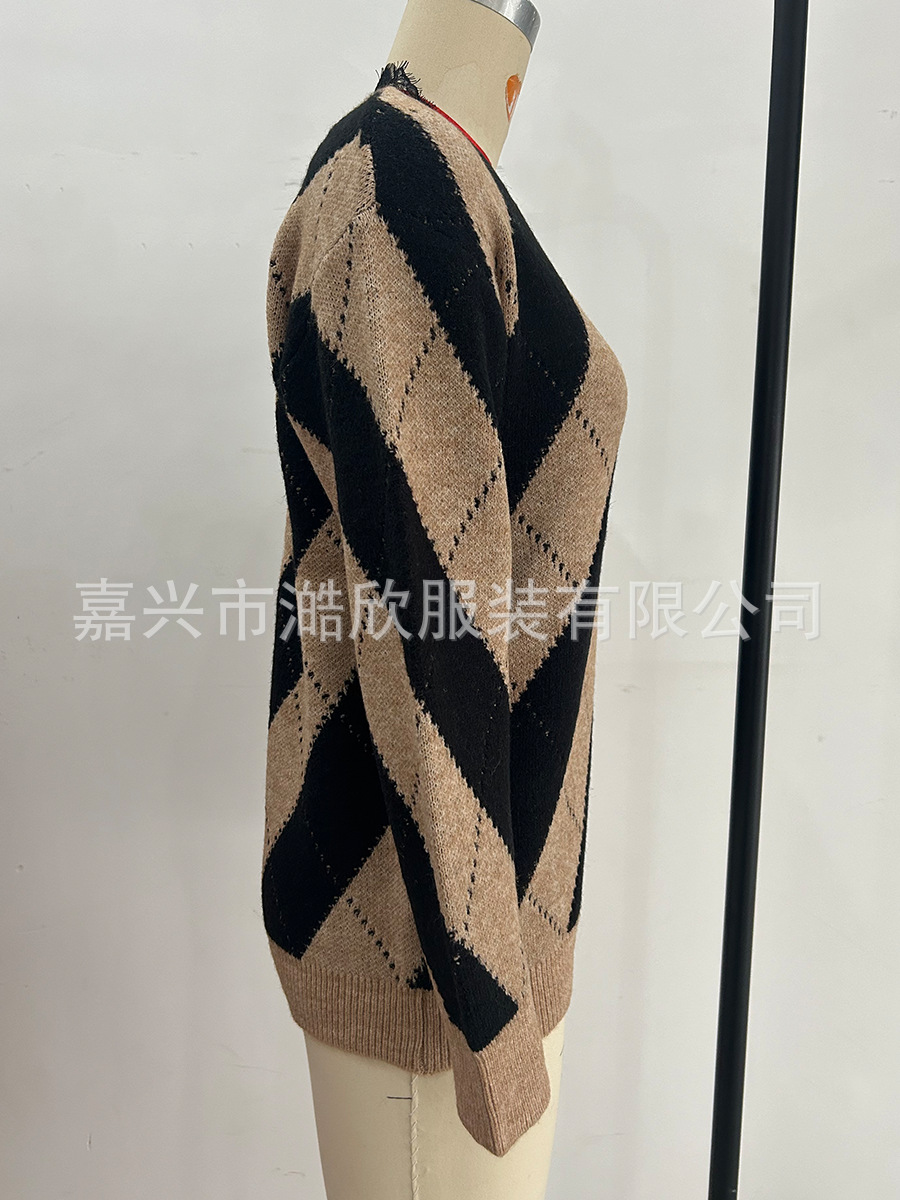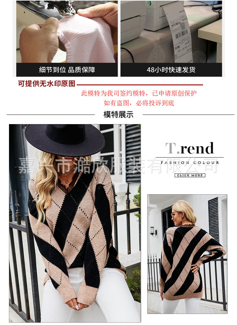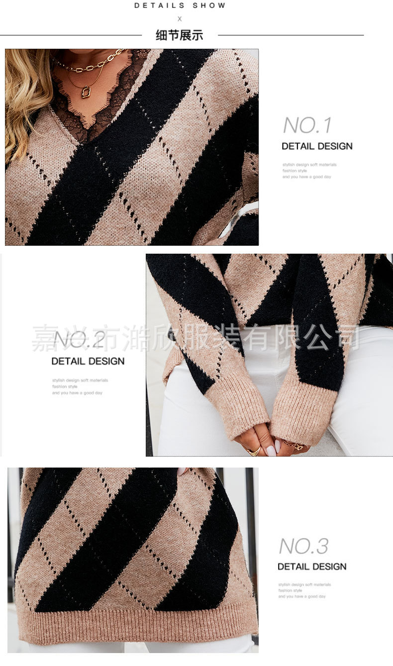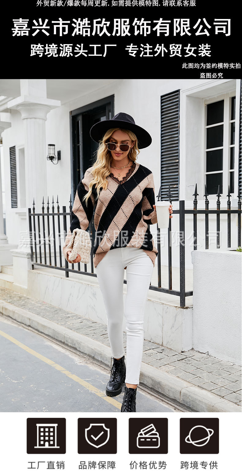 2023 가을과 겨울 새로운 유럽과 미국 대외 무역 여성용 컬러 매칭 레이스 V-넥 캐주얼 스웨터 크로스 보더 풀오버 스웨터스토어 가기