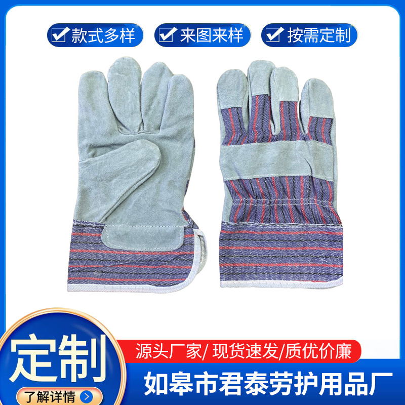 如皋市君泰劳护用品厂是专门从事生产、加工、新产品研发、销售于一体的综合生产型企业。工厂成立于1999年,是经国家相关部门批准注册的企业。地处世界长寿之乡--如皋,临近港口,交通运输便利,到上海港2小时路程。我厂主要生产出口劳动防护用品系列,采用优质牛头层、牛二层 、猪头层 、猪二层、羊皮等皮革及不同成分面料。