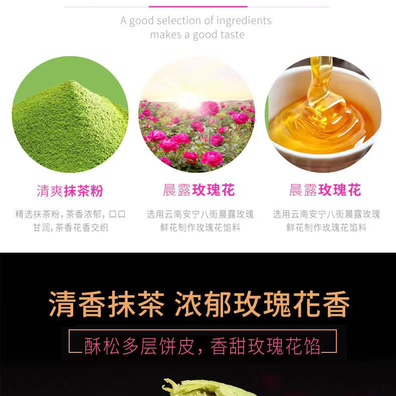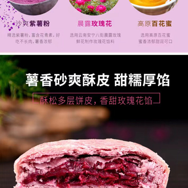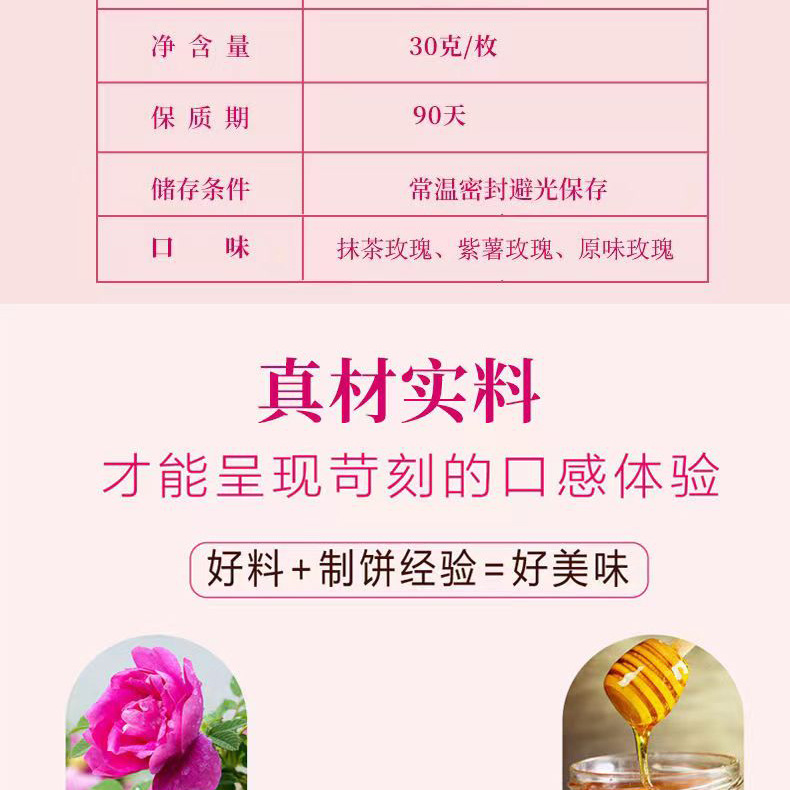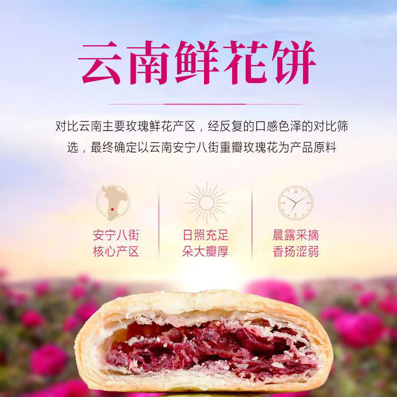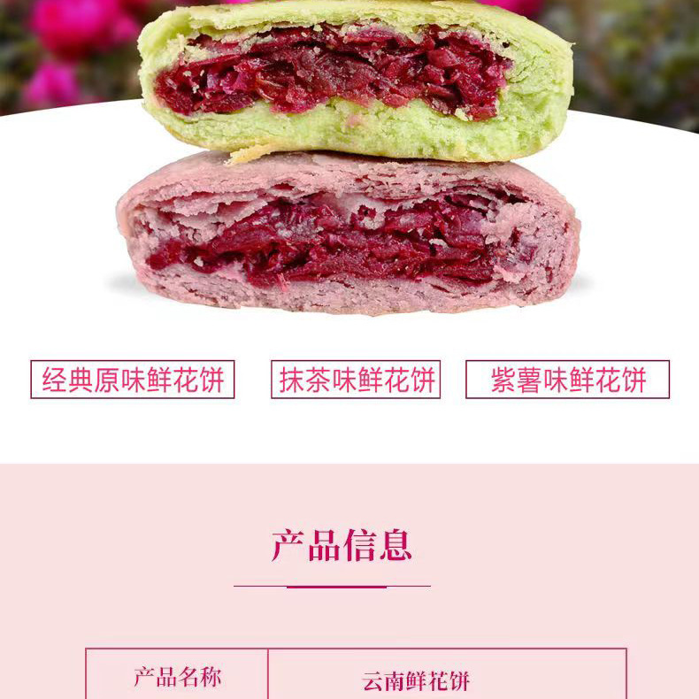 2、鲜花饼批发、零售、一件代发,有袋装240g(8枚*30g)、小礼盒装300g(10枚*30g)、大礼盒装960g(32枚*30g)。其中,小礼盒装可配手提袋,尺寸:36.5cm*12.5cm*29.5cm(1个手提袋可装4盒300g)。鲜花饼箱规:240g袋装,36袋/箱;30g散装,416枚/箱(点击此处可跳转批发)。【加量升级款】32克/枚点此链接跳转 云南鲜花饼有4种口味:玫瑰原味、抹茶口味、紫薯口味、奶香口味。不管送礼还是自己做休闲零食,饼皮香酥,一口花香一口酥。厂家直供,支持一件代发!可定制贴牌、OEM代加工、散装批发采购,量大价优。