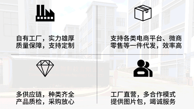 3、工厂支持柔性生产、大小订单均可承接、OEM/ODM代加工、定制贴牌,支持各平台电商、微商、直播带货、超市铺货...欢迎各界朋友莅临参观、指导和业务洽谈!详情请咨询在线客服!
