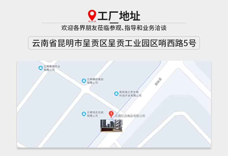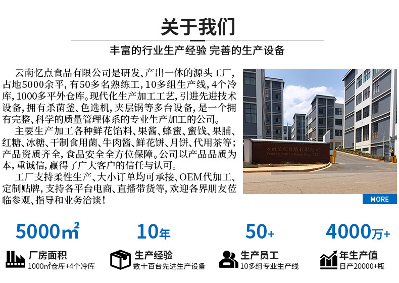 1、云南忆点食品有限公司研发、产出一体的源头工厂,占地5000㎡,仓库1000㎡,4个冷库。现代化生产加工工艺,引进先进技术设备,拥有杀菌釜、色选机、夹层锅等多台设备。是一个拥有完整、科学的质量管理体系的专业生产加工的公司。主要生产加工各种鲜花馅料、果酱、蜂蜜、蜜饯、果脯、红糖、冰糖、干制食用菌、牛肉酱、鲜花饼、月饼、代用茶等;产品资质齐全,食品安全全方位保障。公司以产品品质为本,重诚信,赢得了广大客户的信任与认可。