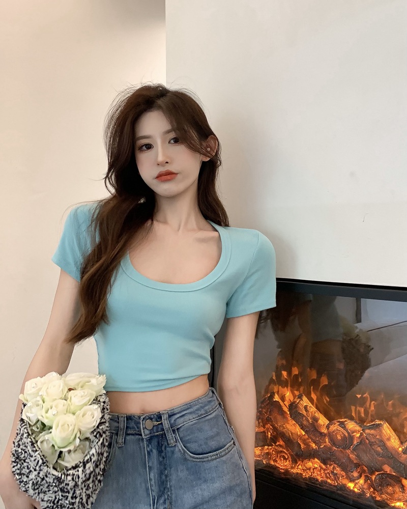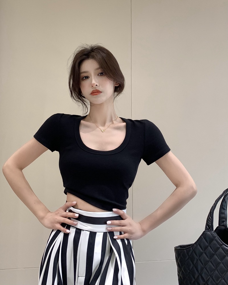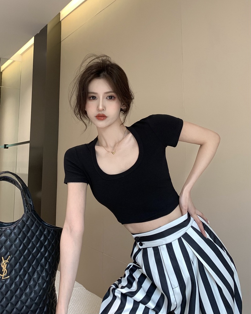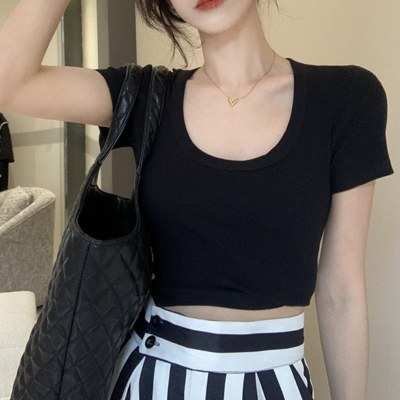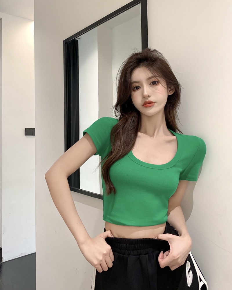 여성용 반팔 여름 2023 새로운 타이트 짧은 배꼽 노출 캐주얼 탑 트렌디 인 스파이스 걸스 순수한 욕망 소녀 티셔츠