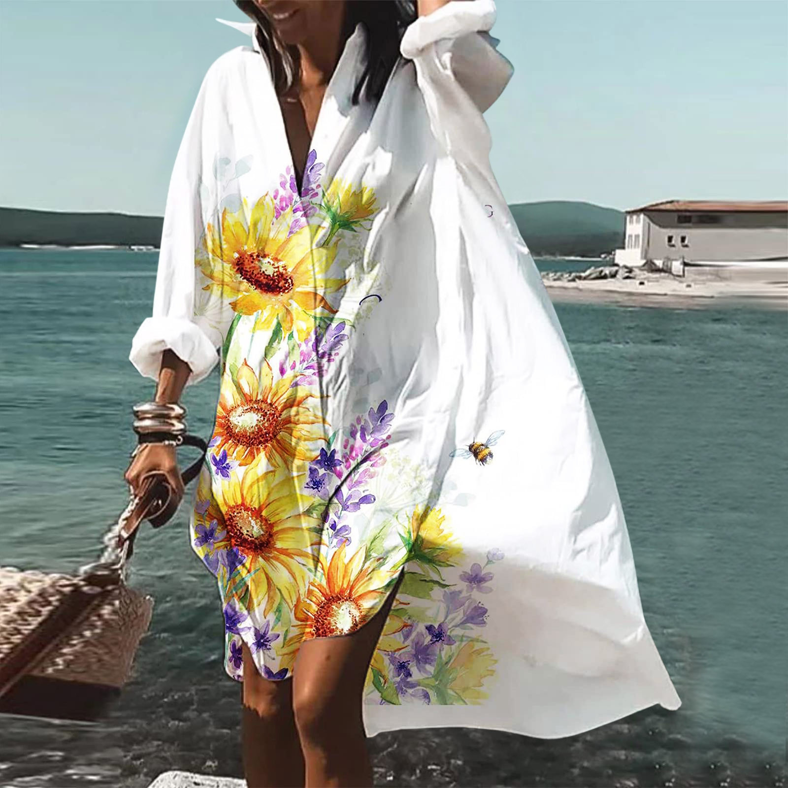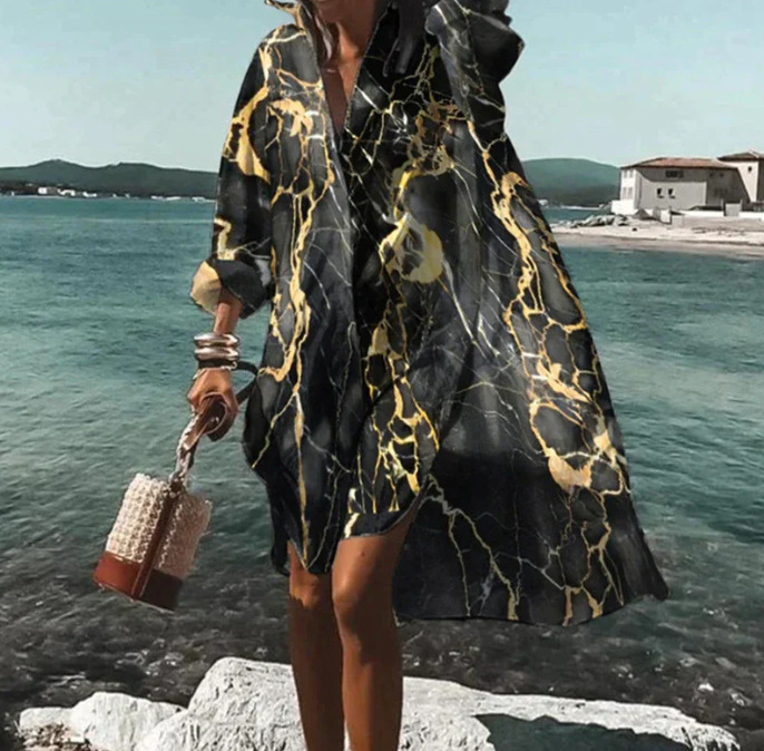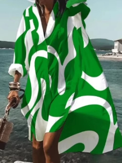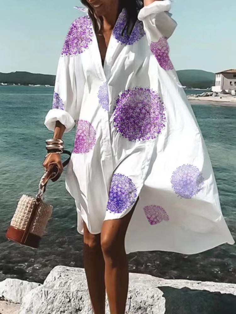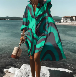 9392 아마존 대외 무역 패션 여성의 느슨한 새로운 디지털 인쇄 긴 소매 옷깃 셔츠 원피스