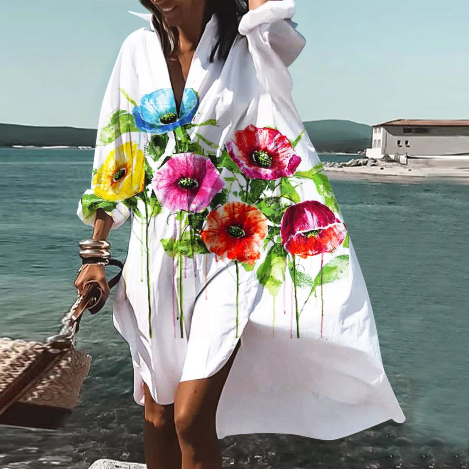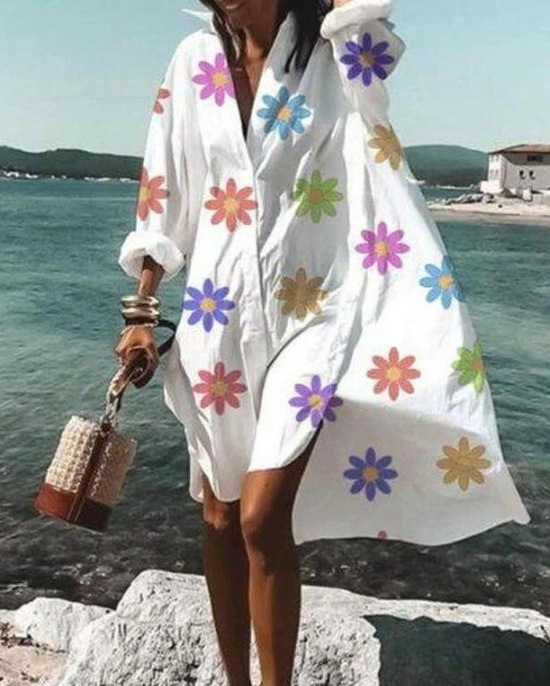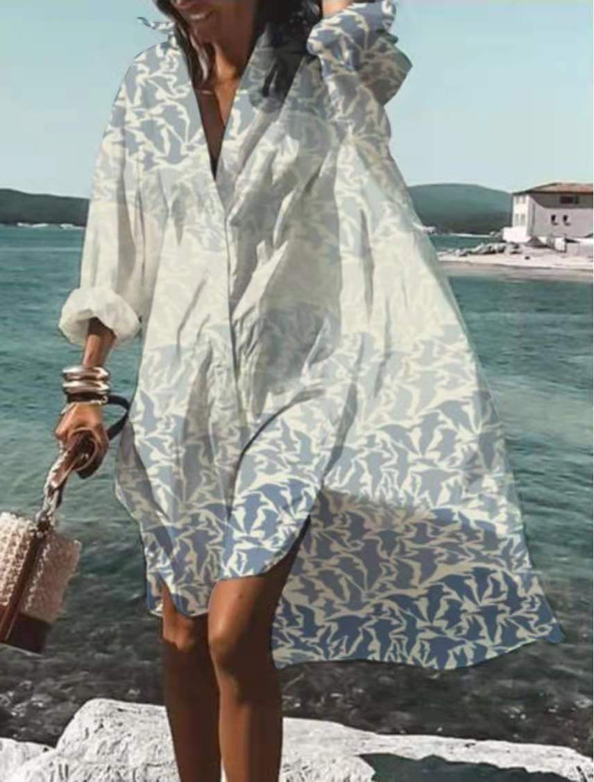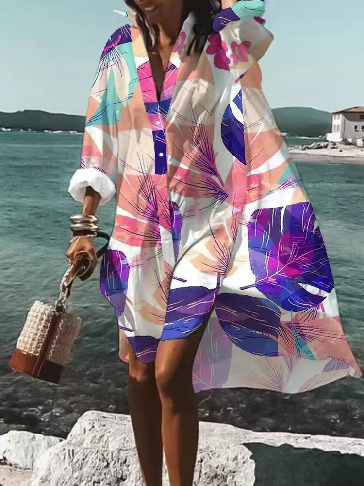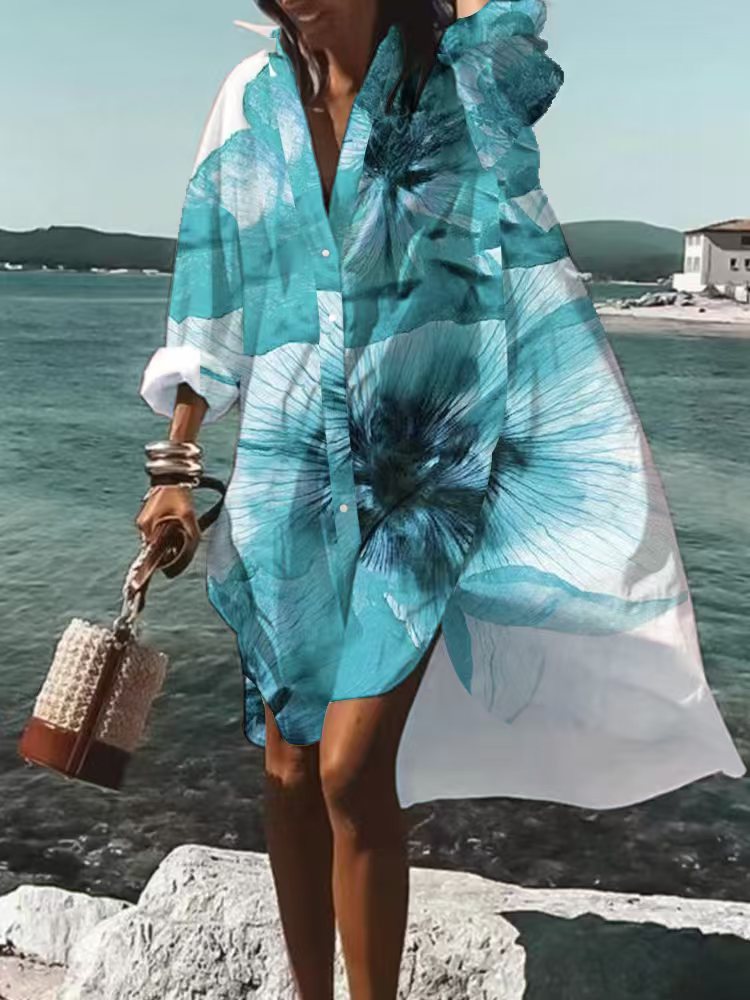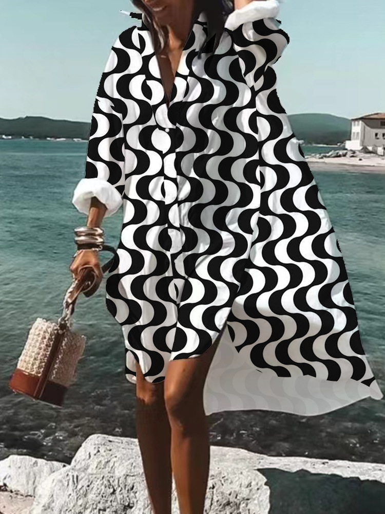 9392 아마존 대외 무역 패션 여성의 느슨한 새로운 디지털 인쇄 긴 소매 옷깃 셔츠 원피스스토어 가기