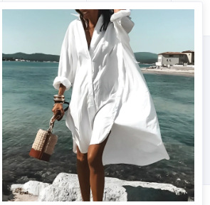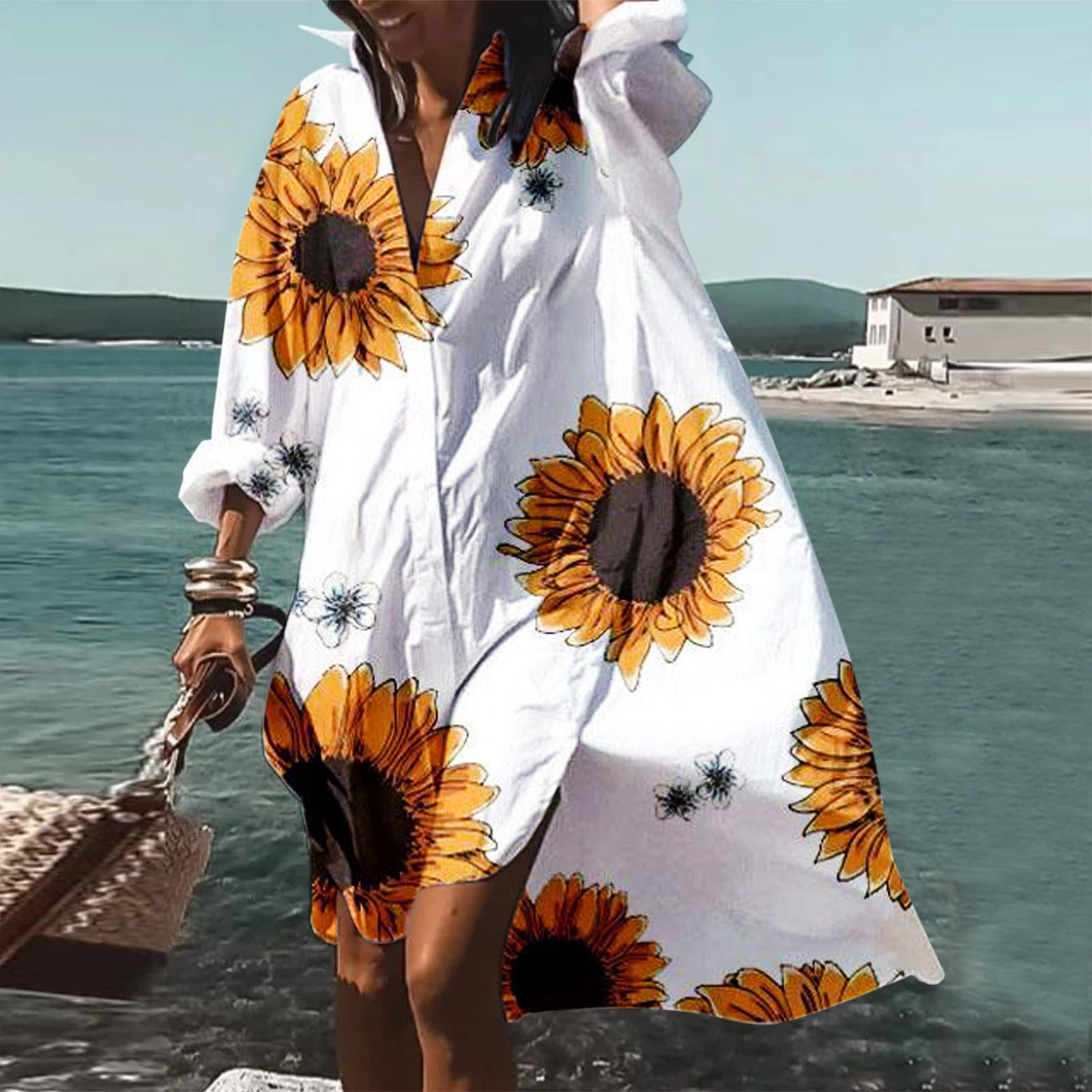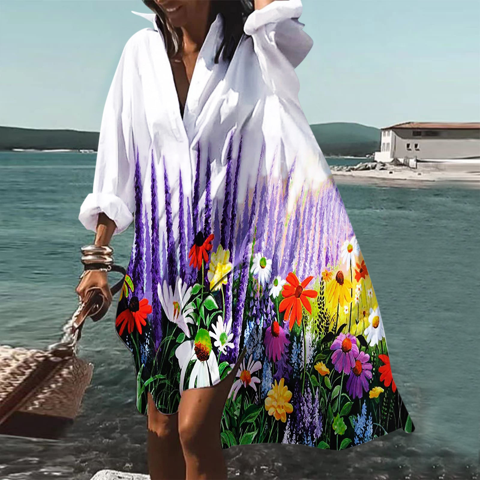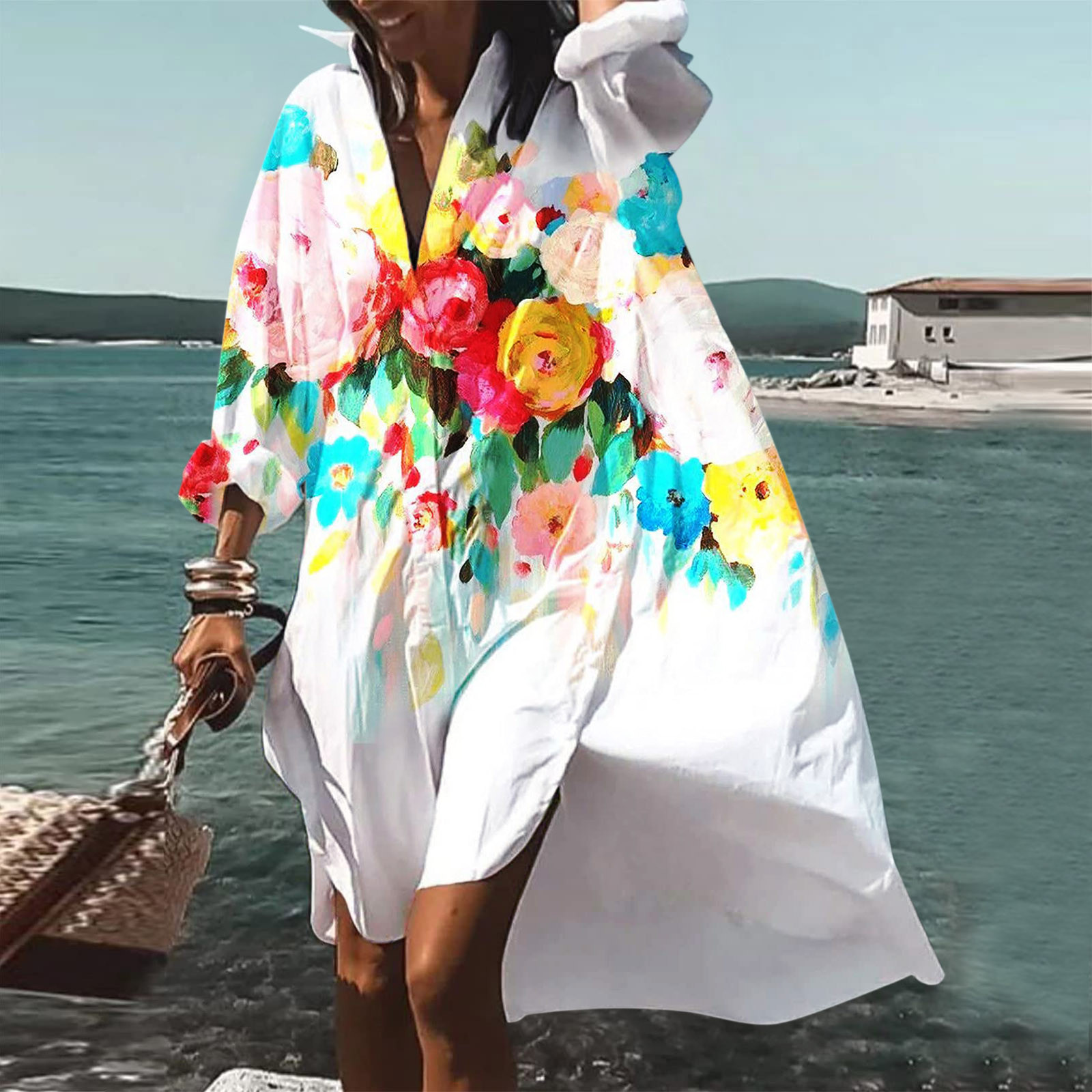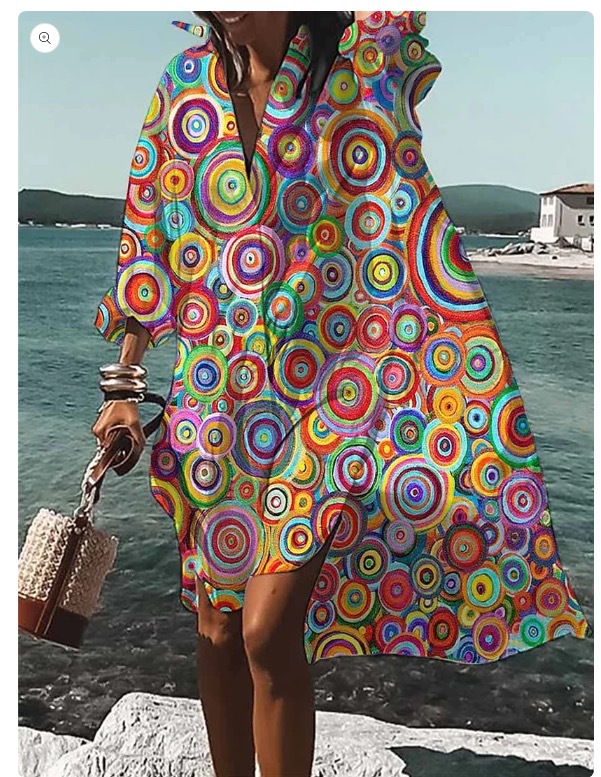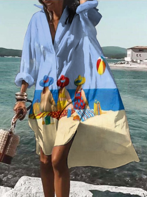 9392 아마존 대외 무역 패션 여성의 느슨한 새로운 디지털 인쇄 긴 소매 옷깃 셔츠 원피스스토어 가기