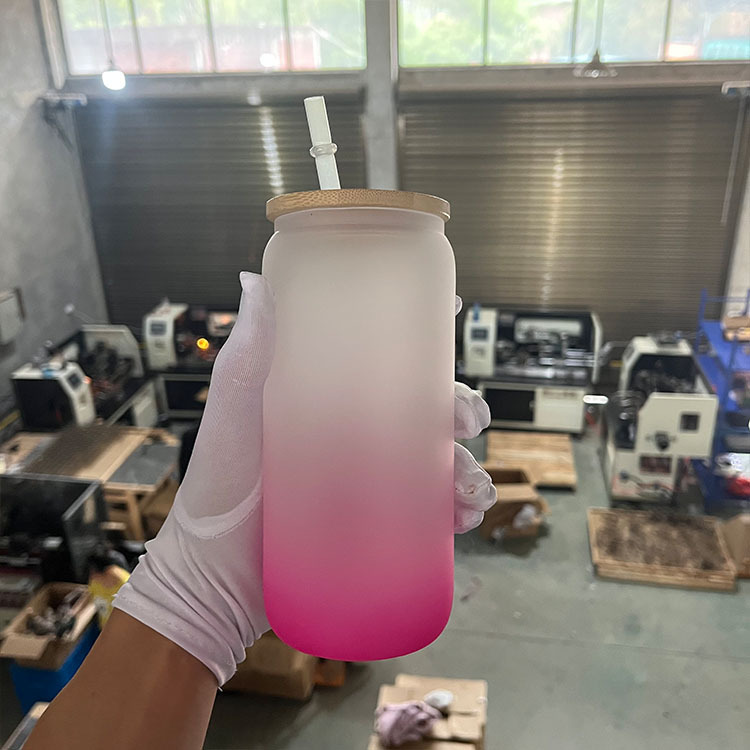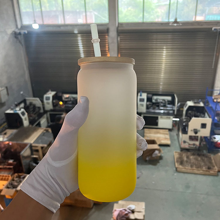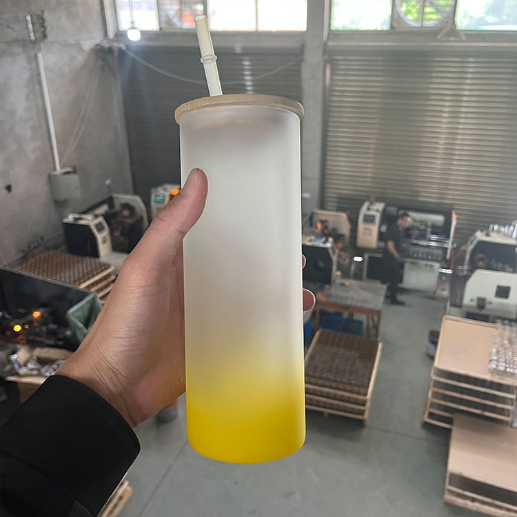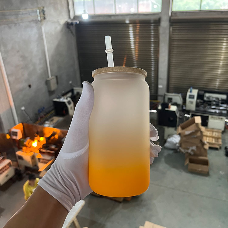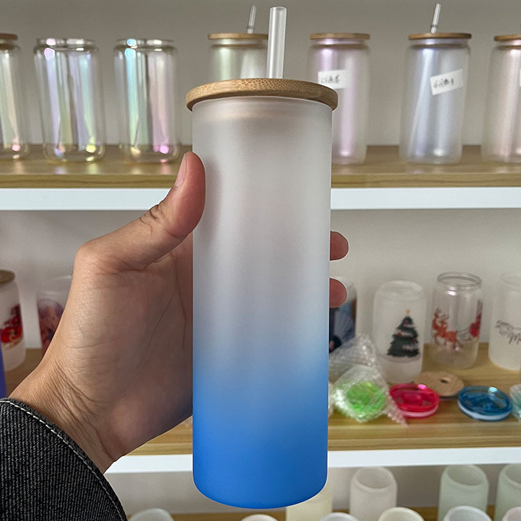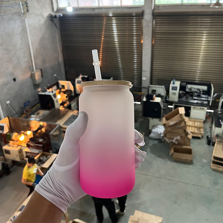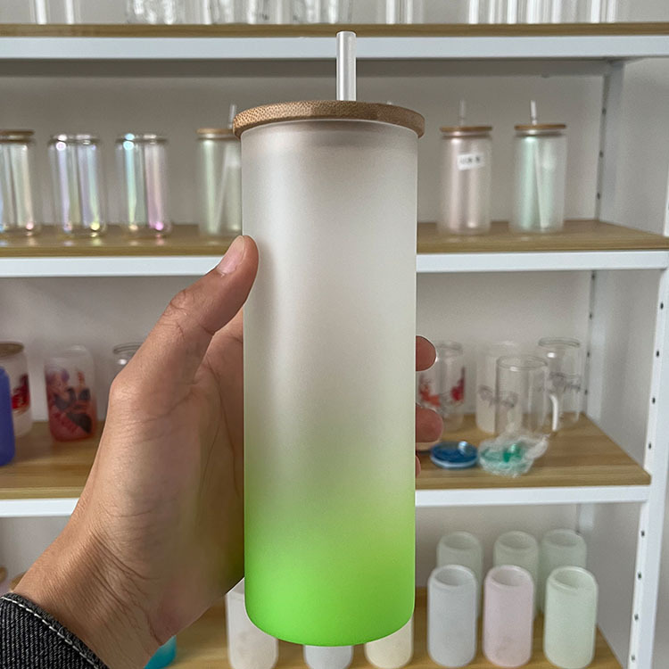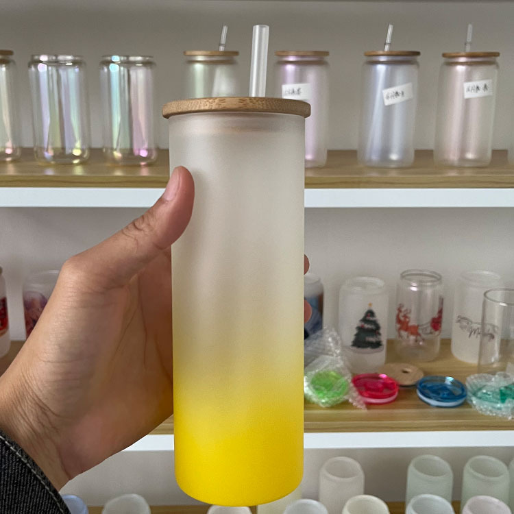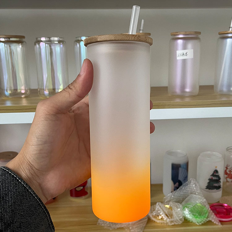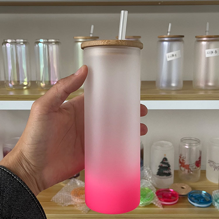 도매 열 승화 특수 유리 그라디언트 젖빛 유리 빨대 컵 메이슨 항아리 냉각 색상 변경 대나무 뚜껑 물 컵