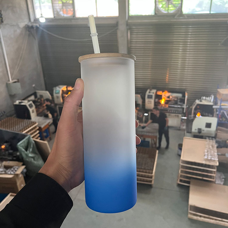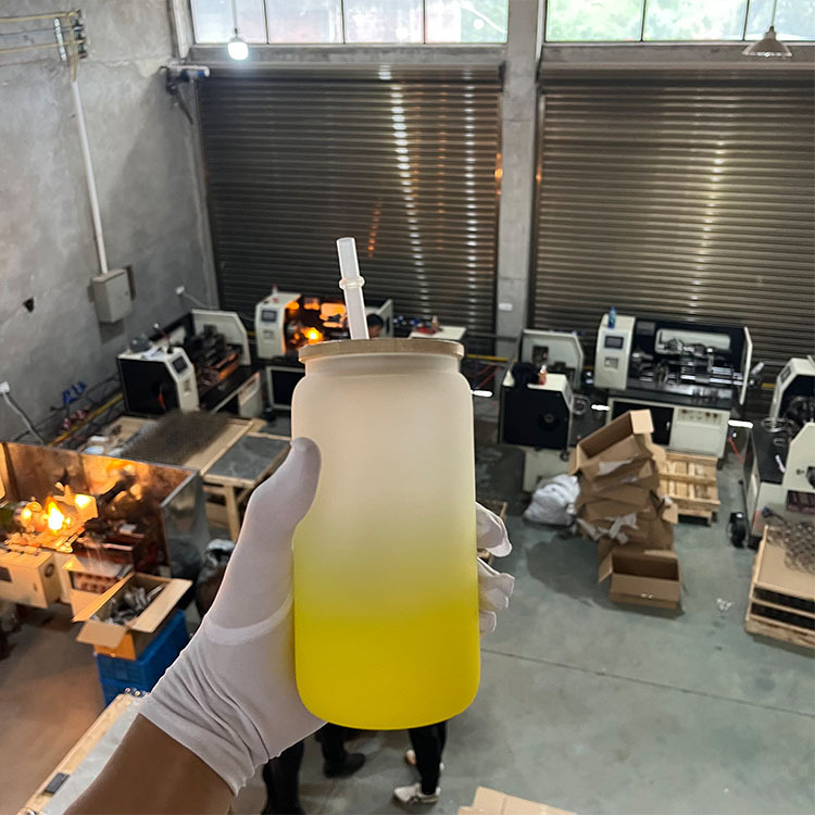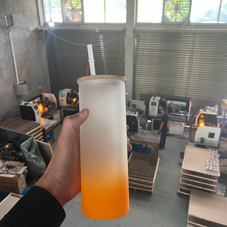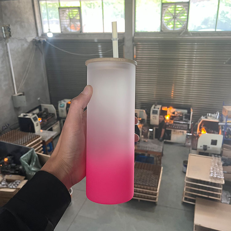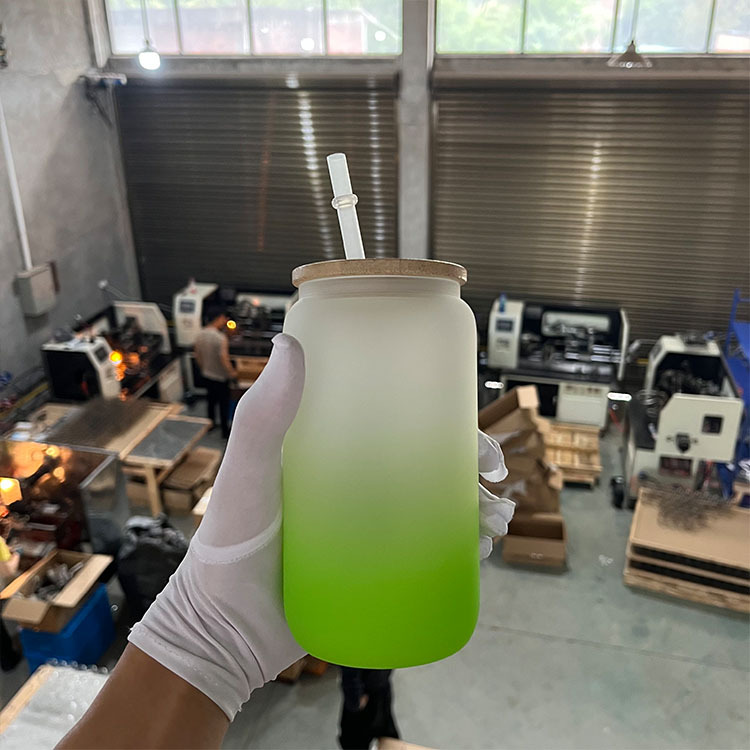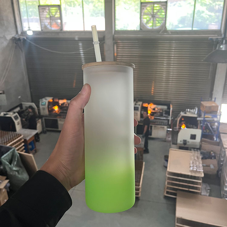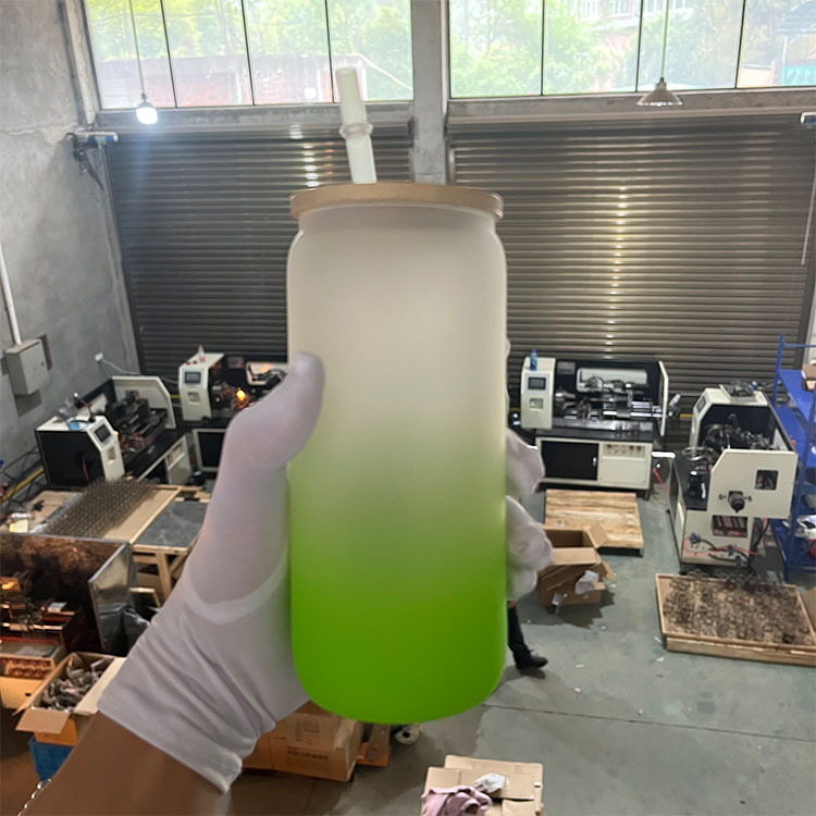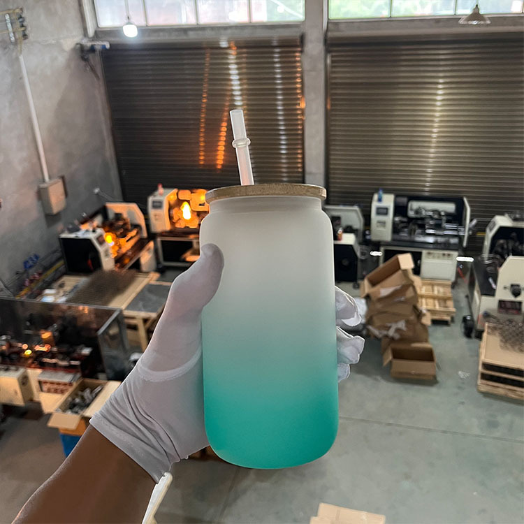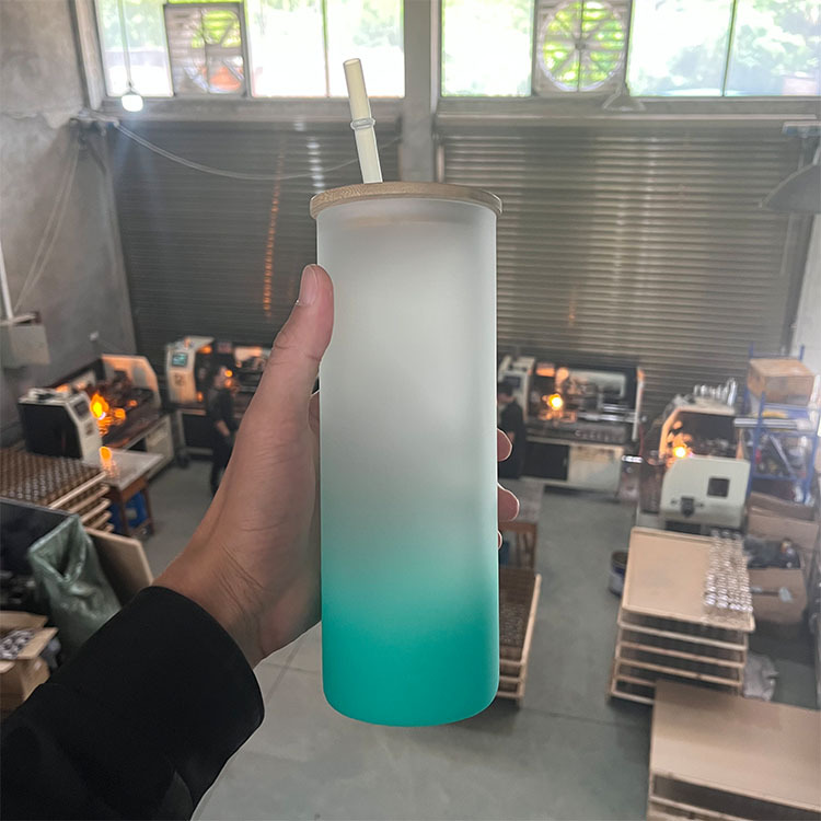 도매 열 승화 특수 유리 그라디언트 젖빛 유리 빨대 컵 메이슨 항아리 냉각 색상 변경 대나무 뚜껑 물 컵