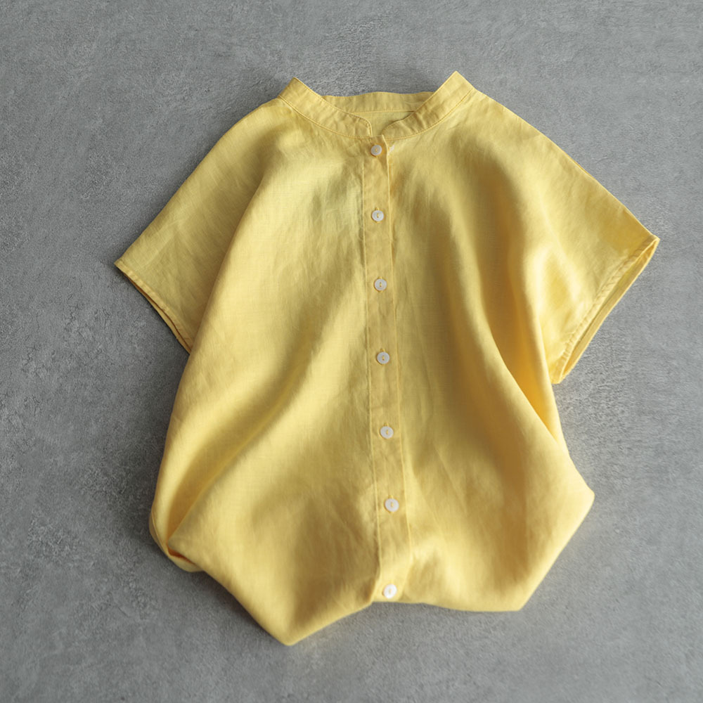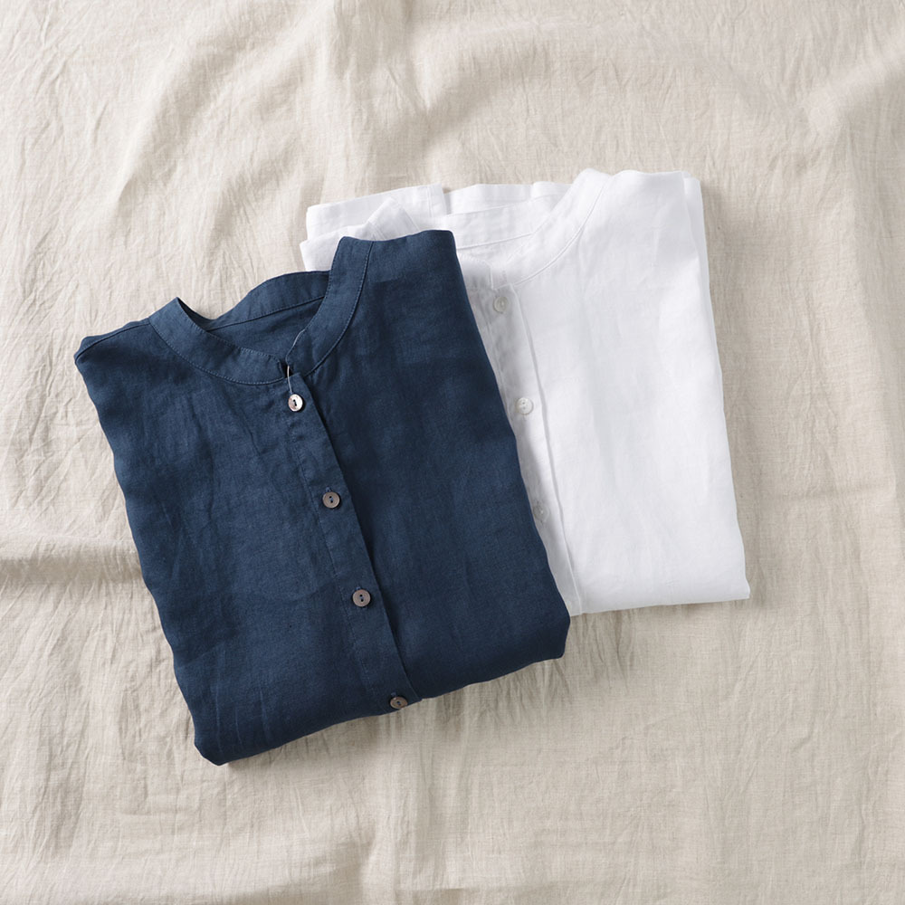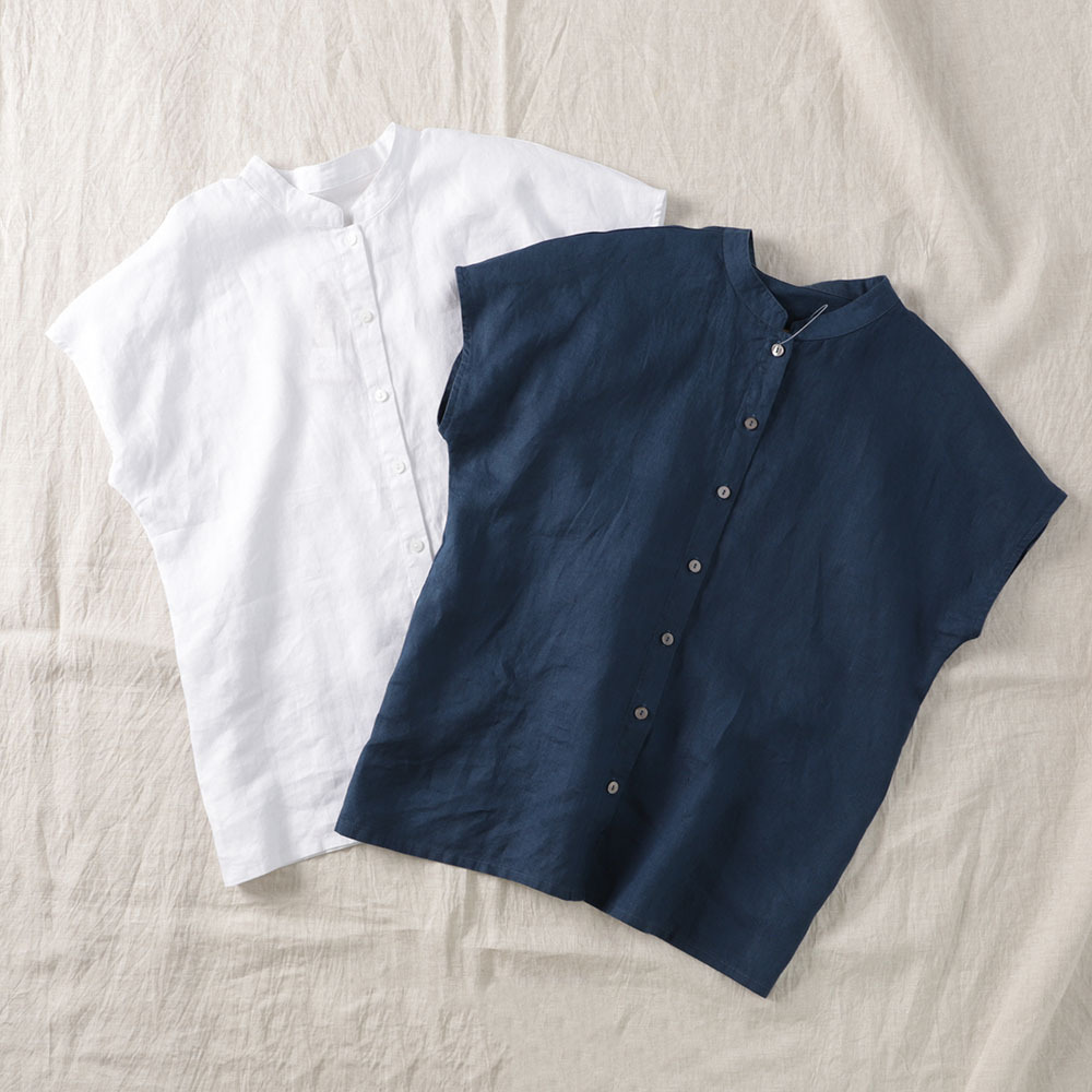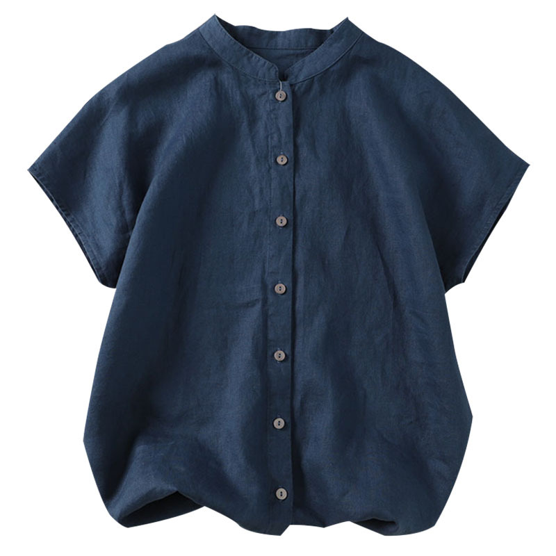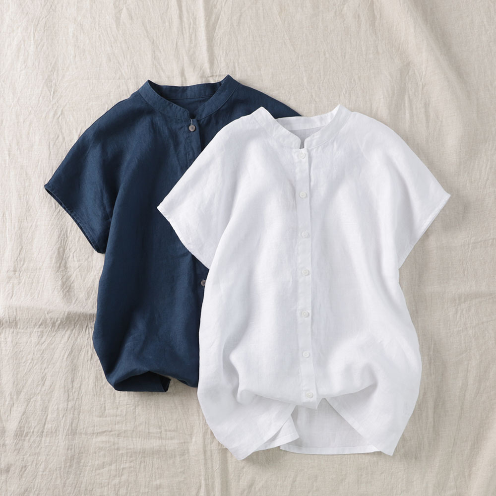 2026년 여름 신상품 예술적인 루즈핏 솔리드 컬러 면마 스타일 카라 반팔 셔츠 여성용 셔츠 상의스토어 가기