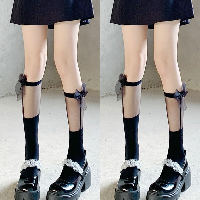 무란 리본 양말 여성용 중간 길이 로리타 일본식 달콤한 스티치 jk 종아리 양말 여름 얇은 투명 양말