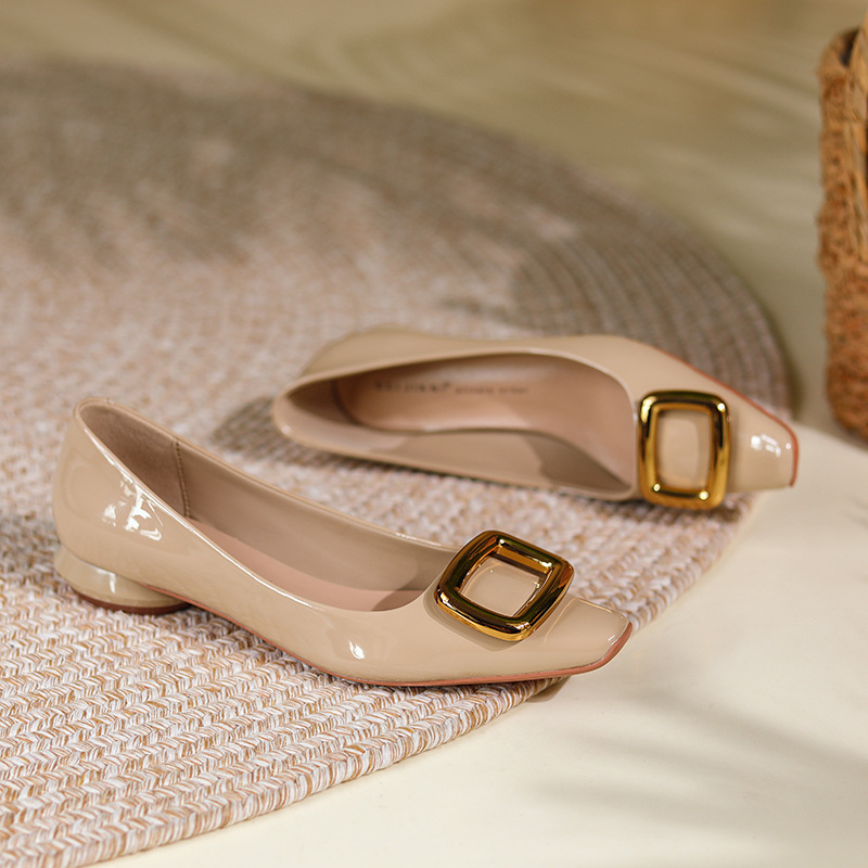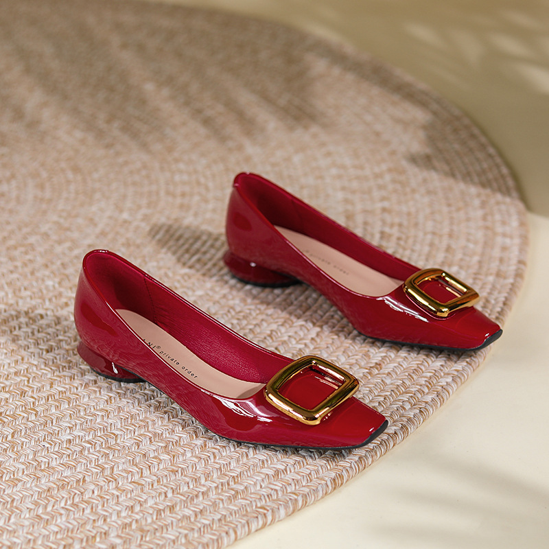 7318-15 작은 빨간 승마 책 폭발 사각 버클 싱글 신발 여성용 에나멜 가죽 스퀘어 헤드 두꺼운 굽 얕은 입 플랫 플랫 슈즈 양가죽 패드