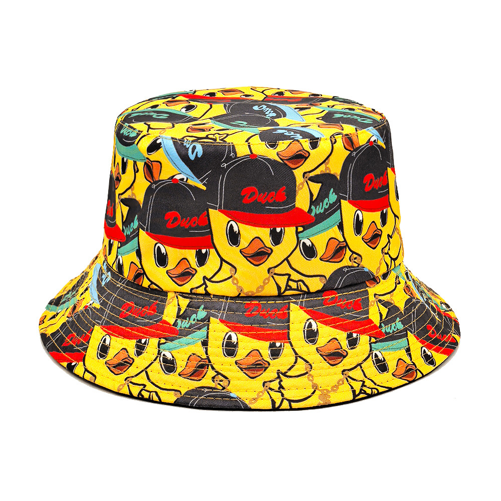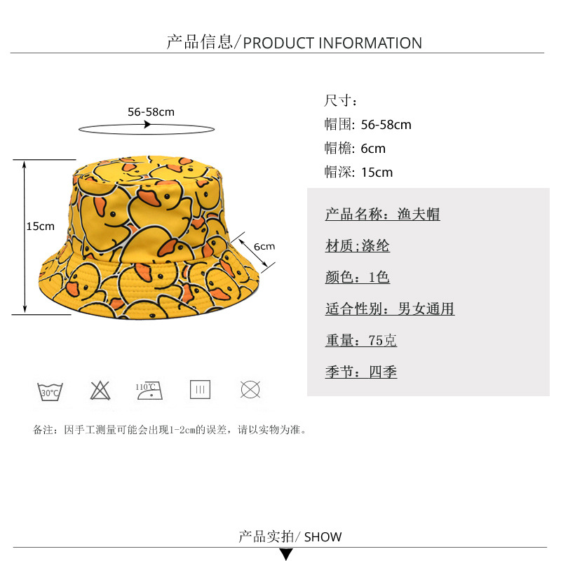 유럽과 미국의 새로운 스타일 작은 노란 오리 프린트 어부 모자 남녀 공용 양면 자외선 차단 모자 패션 만화 오리 모자스토어 가기