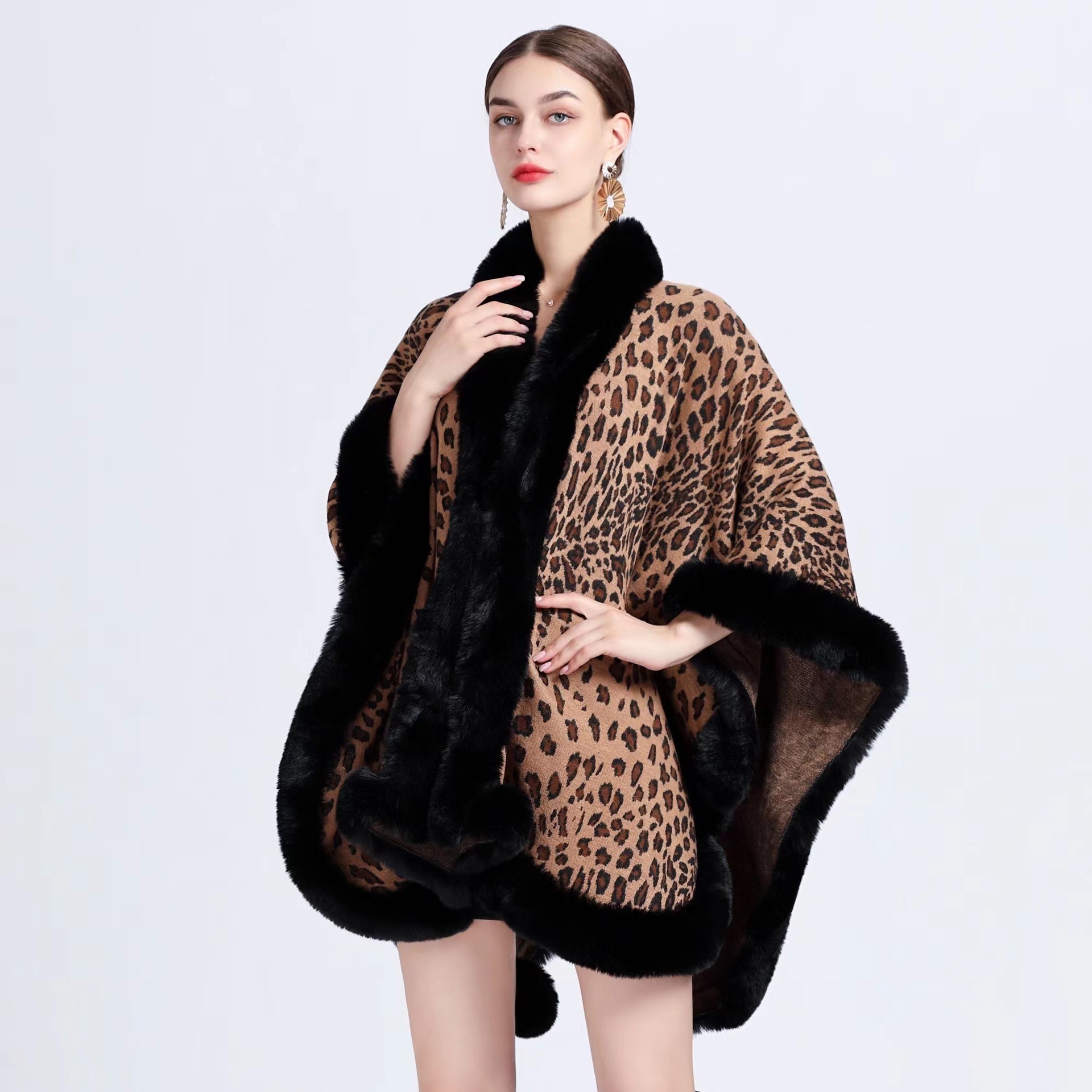 808 # 유럽과 미국 가을과 겨울 새로운 모조 렉스 토끼 모피 칼라 레오파드 무늬 자카드 목도리 케이프 플러스 사이즈 니트 카디건 코트 여성