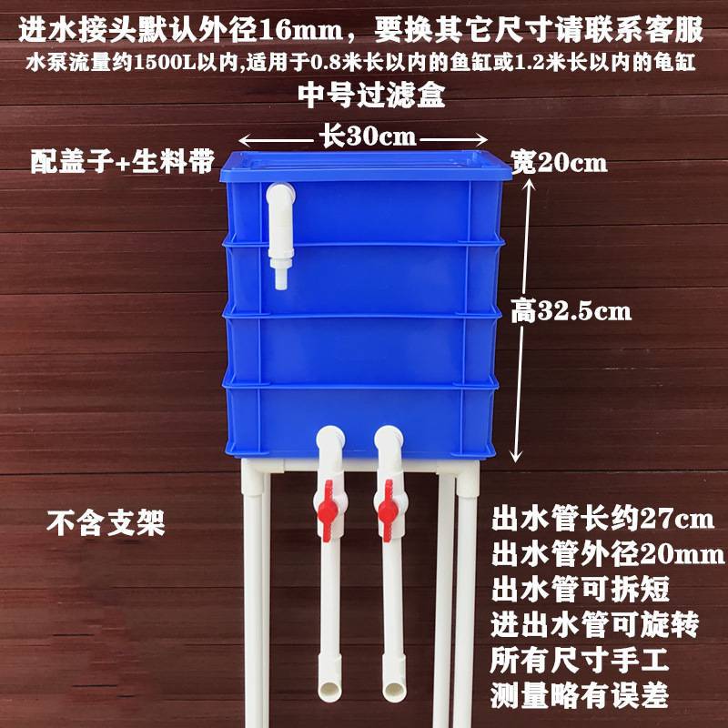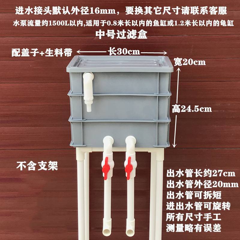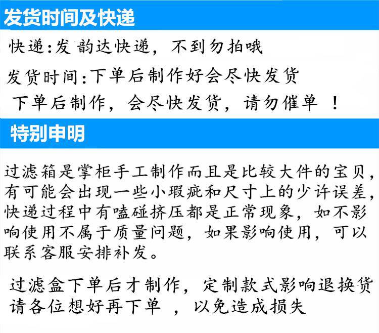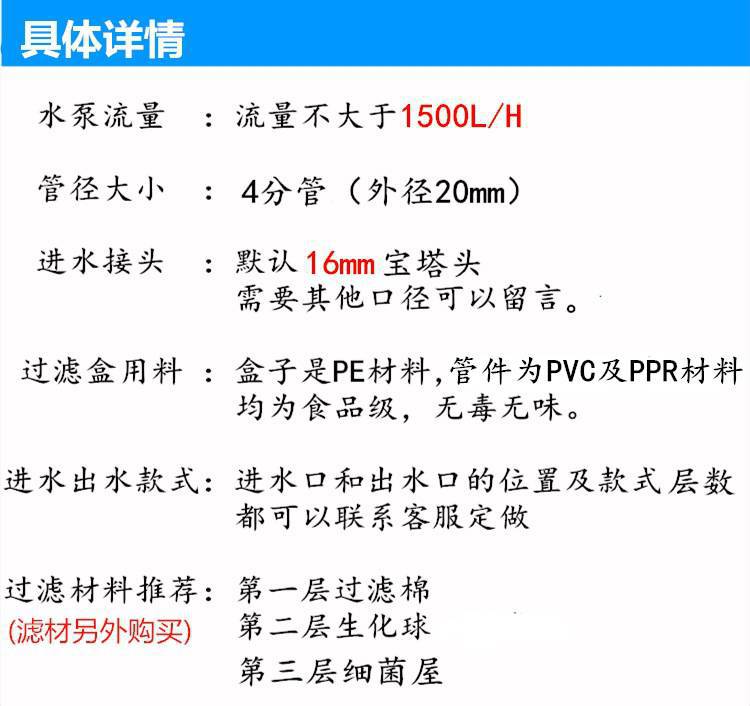 赠品送有:生料带一个和硝化细菌两颗下单前请一定要看清各编号的尺寸,图片上标的尺寸为过滤盒箱底的总长宽。1#、2#默认配12进水接头和单根雨淋管,3#,4#,5#默认配16进水接头方形雨淋管,要换成其它尺寸进水接头请联系客服。1#,2#,4#和5#如要其它尺寸层数或颜色的可联系客服。