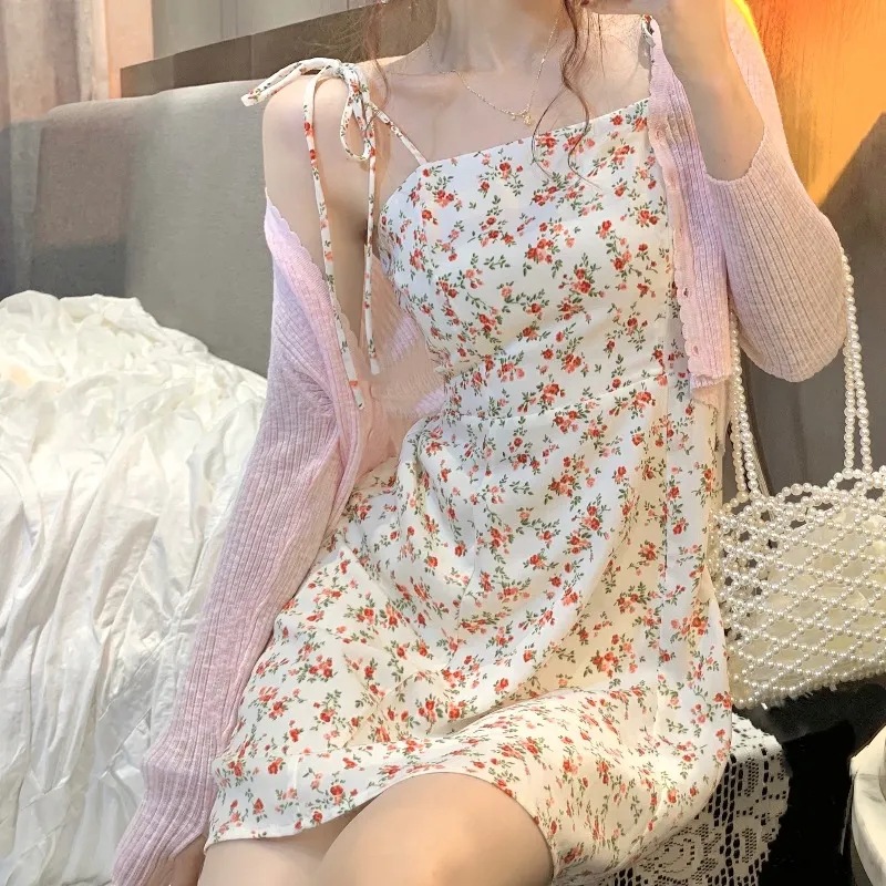 2024 달콤하고 매운 스타일 꽃 원피스 여성 여름 새로운 부드러운 짧은 스커트 얇은 선스크린 카디건 투피스 세트