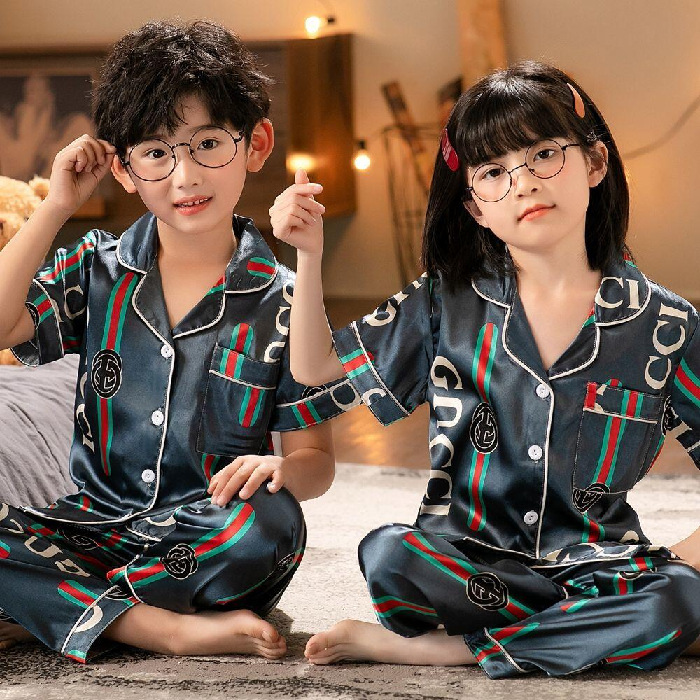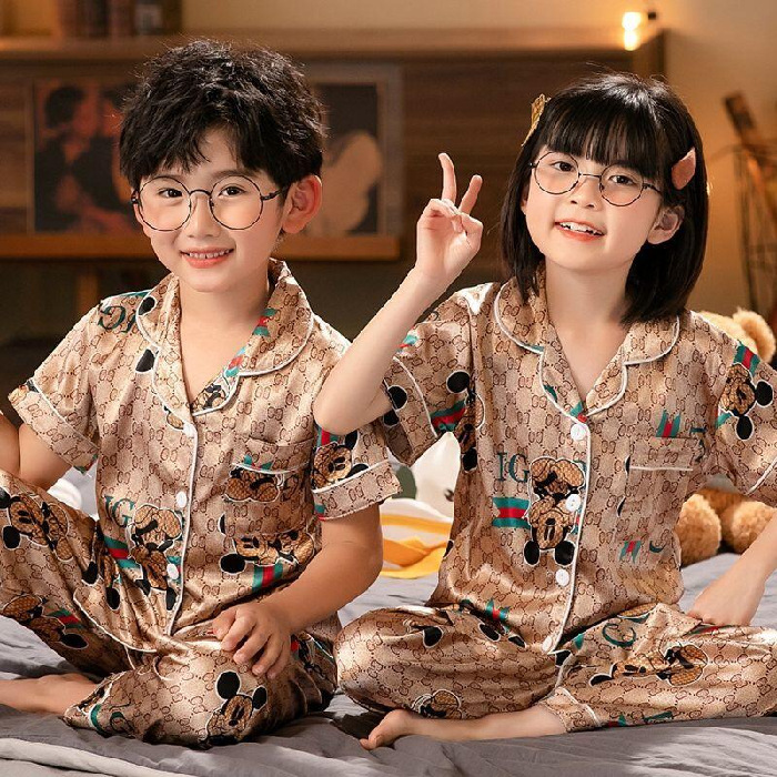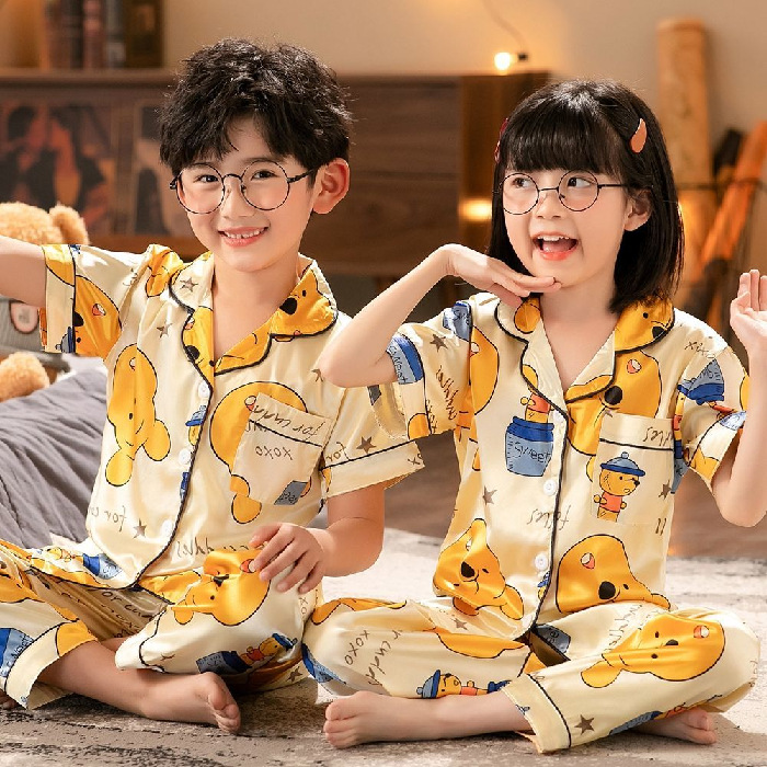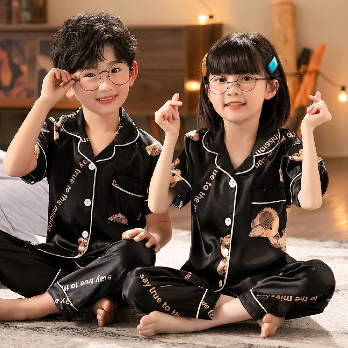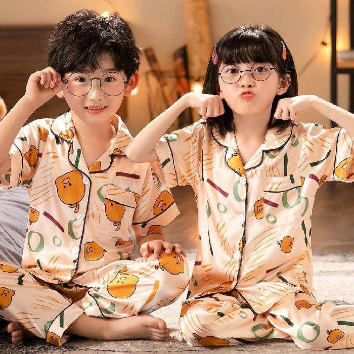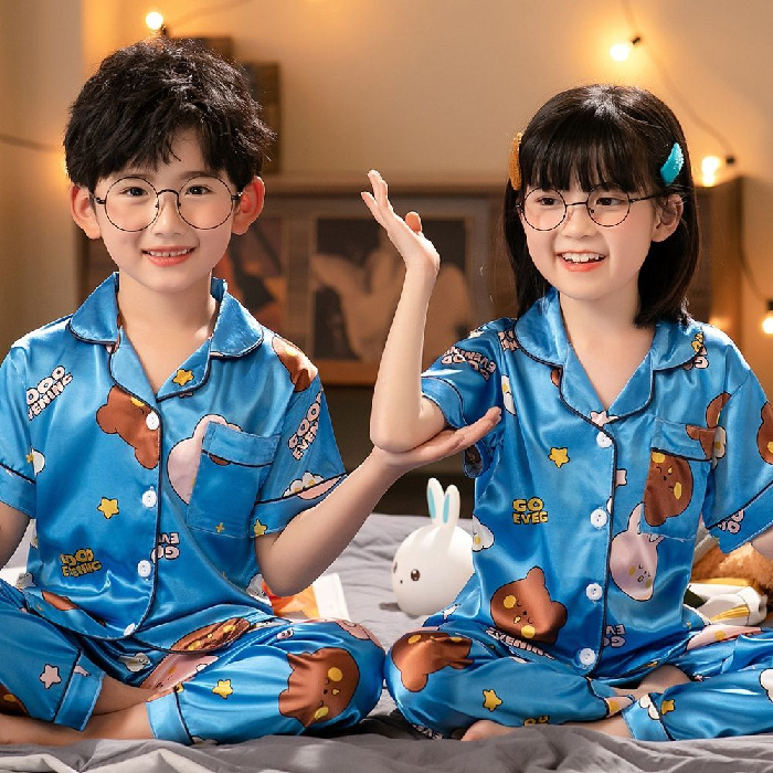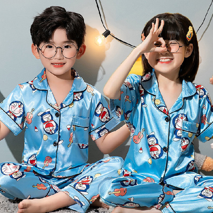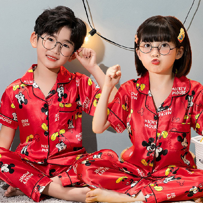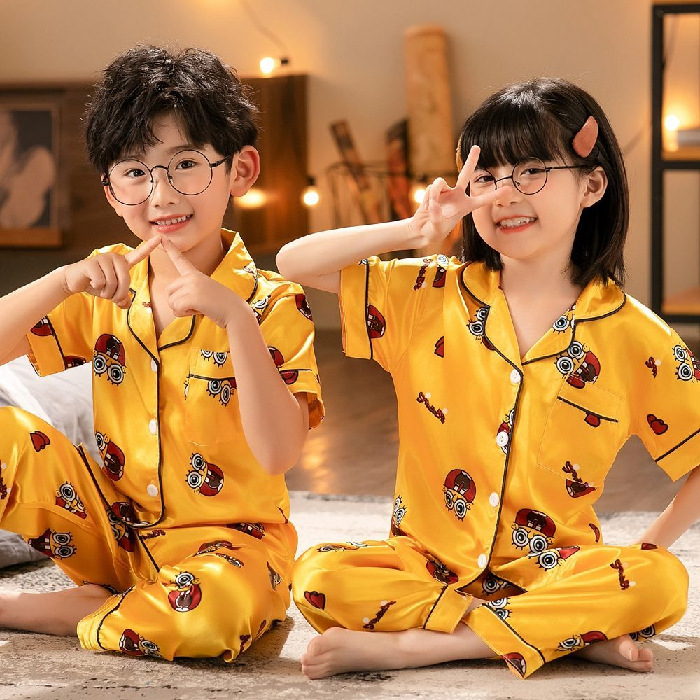 여름 대외 무역 어린이 잠옷 아이스 실크 반팔 카디건 소년과 소녀 귀여운 만화 느슨한 모조 실크 가정 옷