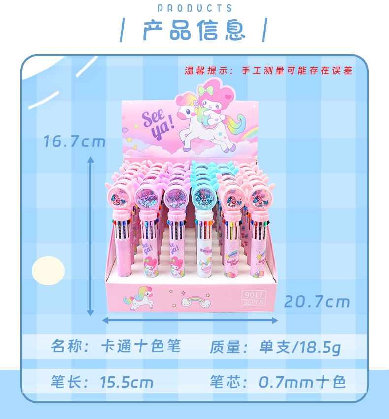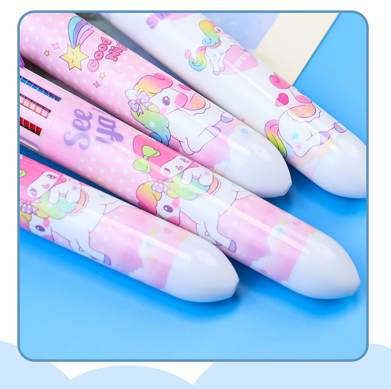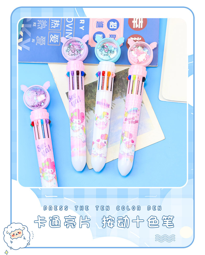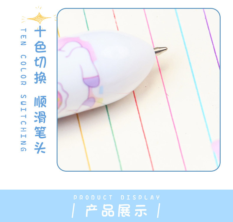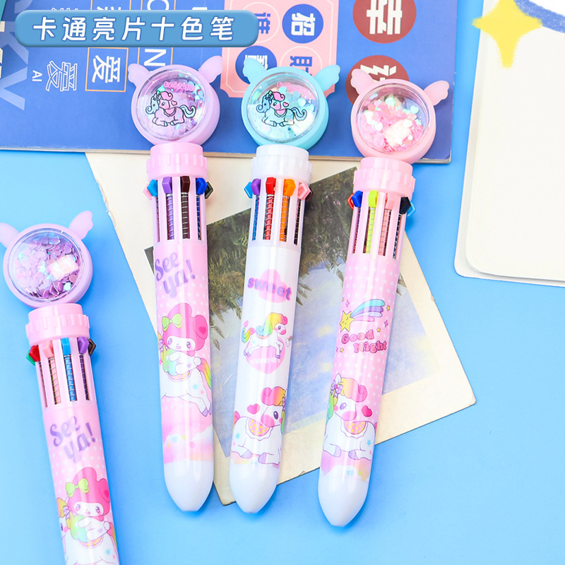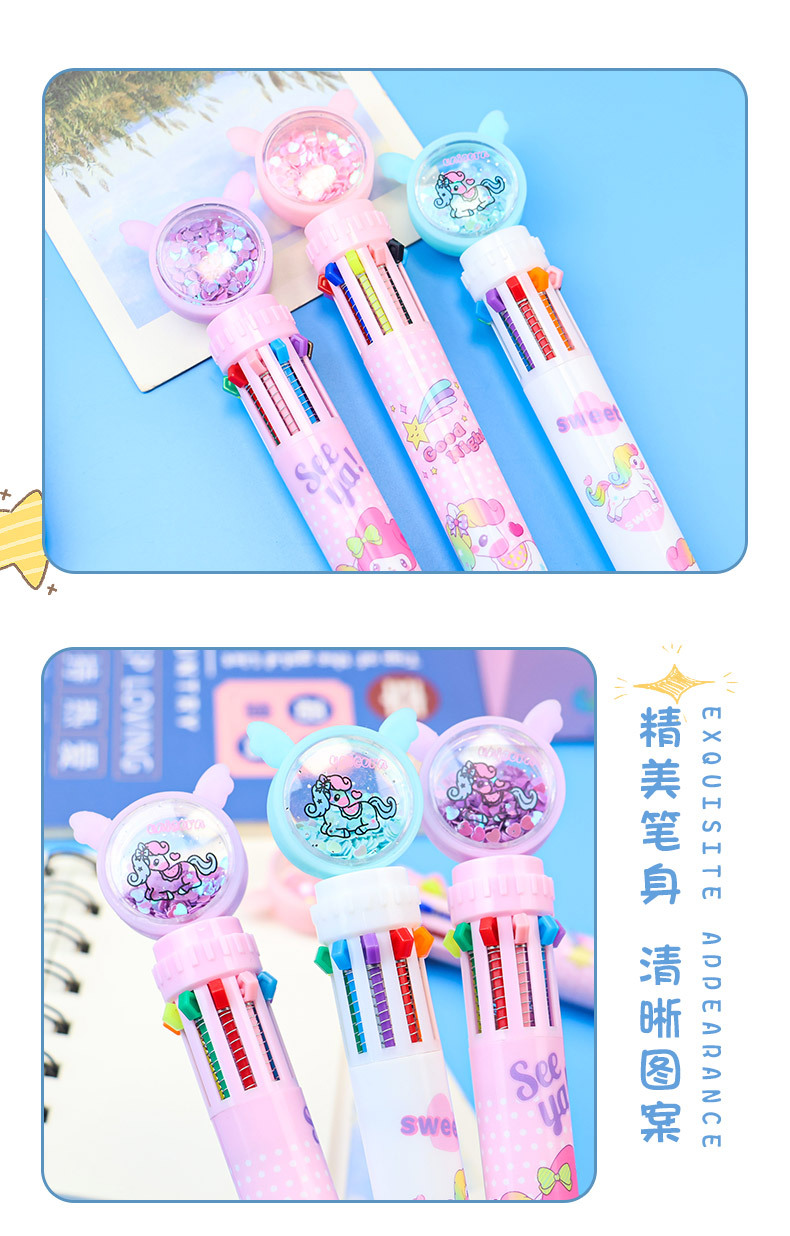 만화풍 심플하고 귀여운 유니콘 글리터 10색 볼펜, 학생들이 부드럽게 쓸 수 있는 다색 볼펜
