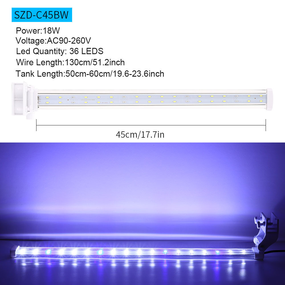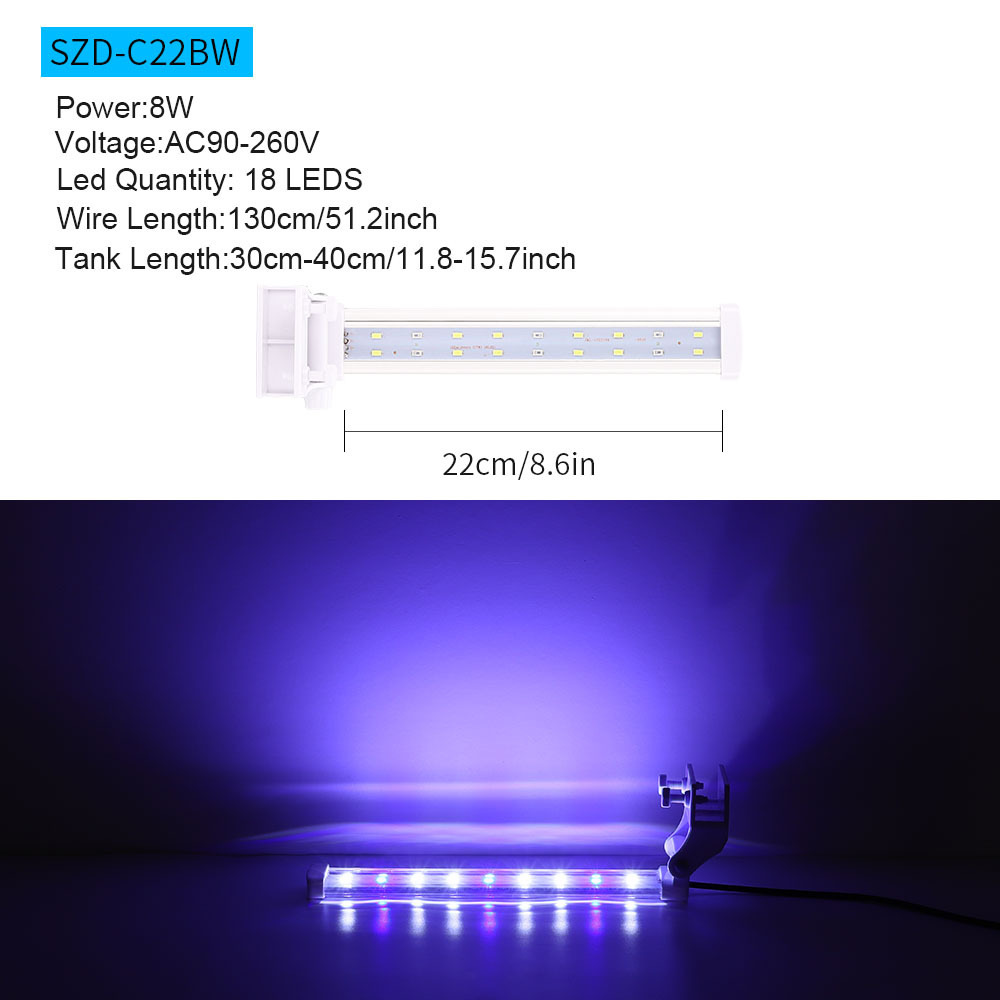 特点:蓝白灯光、高亮度、高颜值、高质量,适合水草生长、鱼缸造景、夹子式固定方式,适用鱼缸范围更广