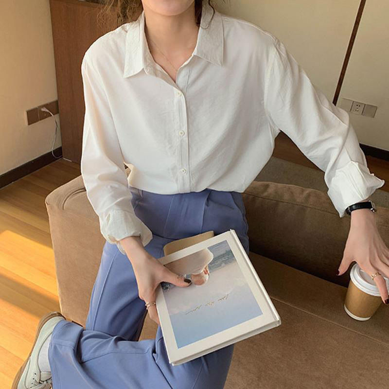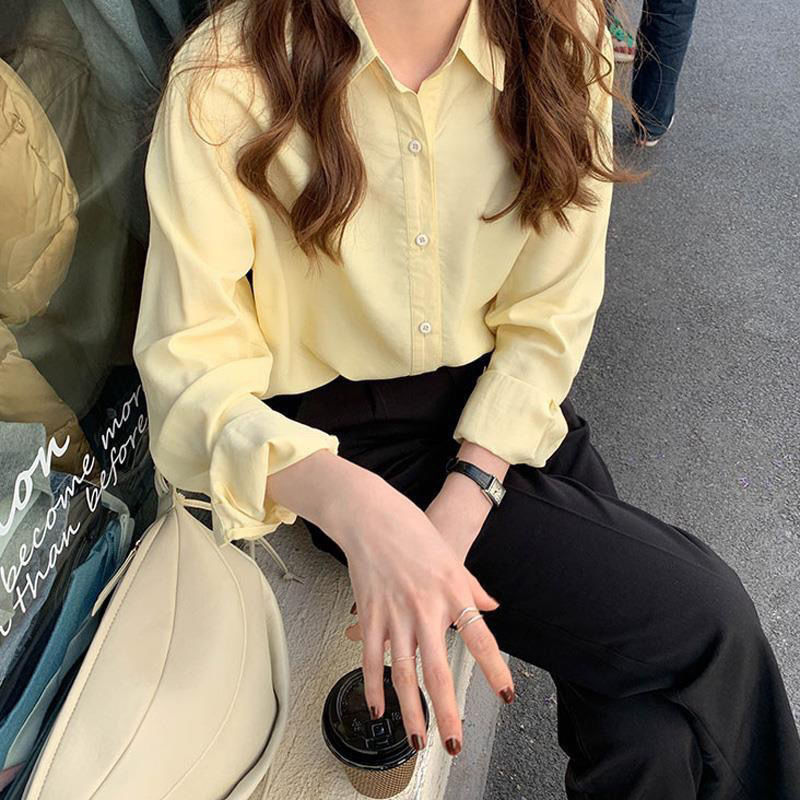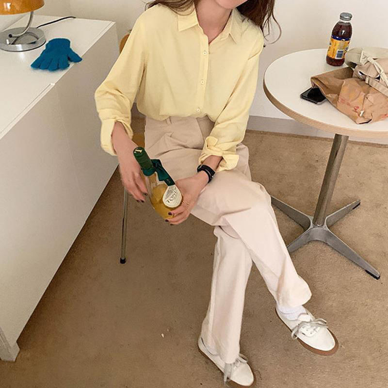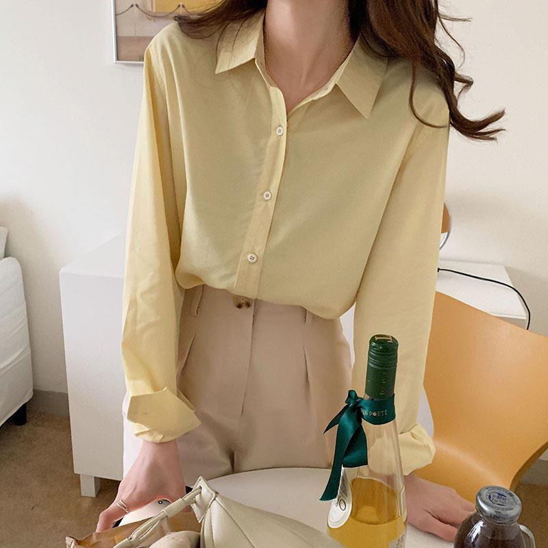 핀 소녀 크림 노란색 셔츠 라이트 옐로우 상단 부드러운 기질 드레이핑 느슨한 사탕 긴 소매 셔츠 코트