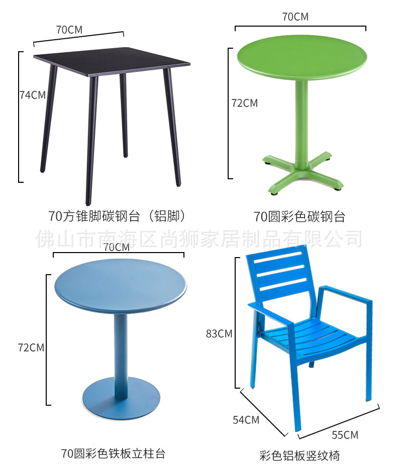 • 원추형 풋 카본 스틸 테이블 (알루미늄 풋) 70 개 + 컬러 알루미늄 플레이트 세로 패턴 의자