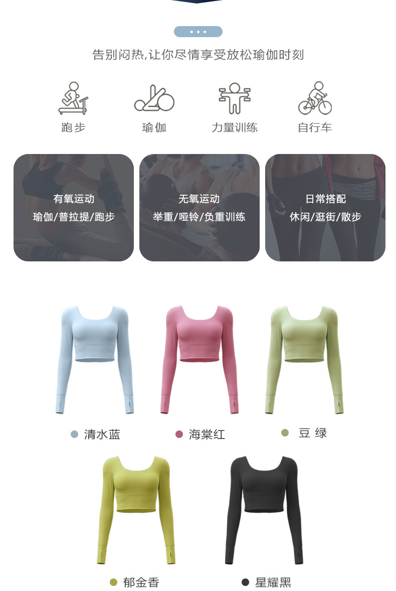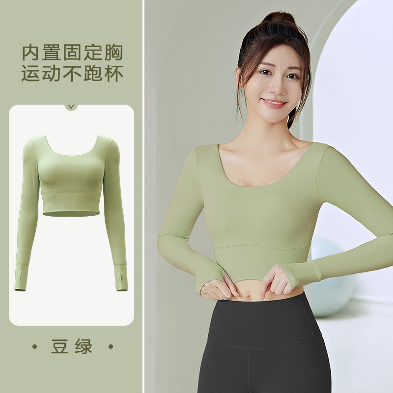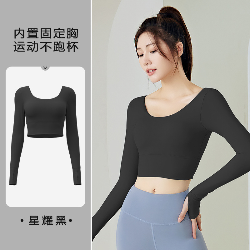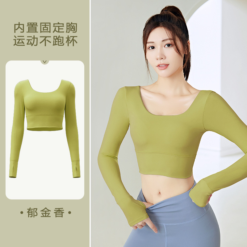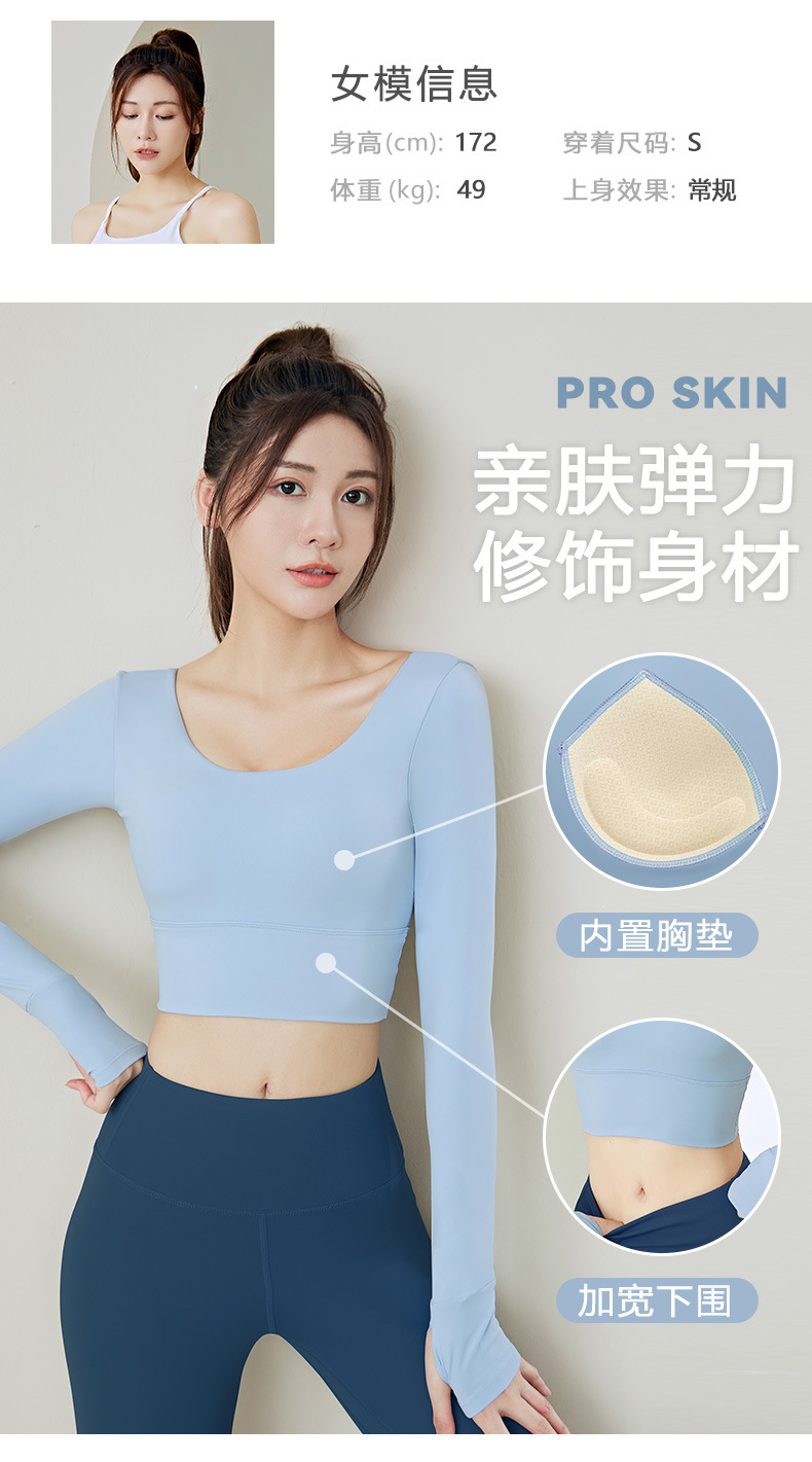주이탕 단색 나일론 타이트핏 러닝 크롭탑 가슴 패드 내장 스포츠 피트니스 긴팔 요가복