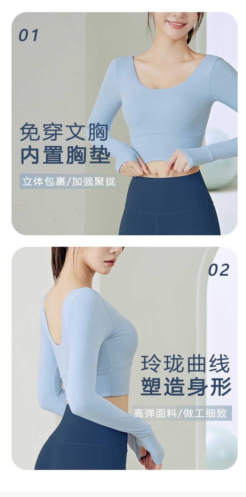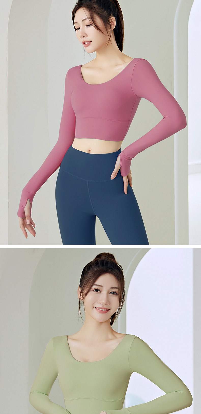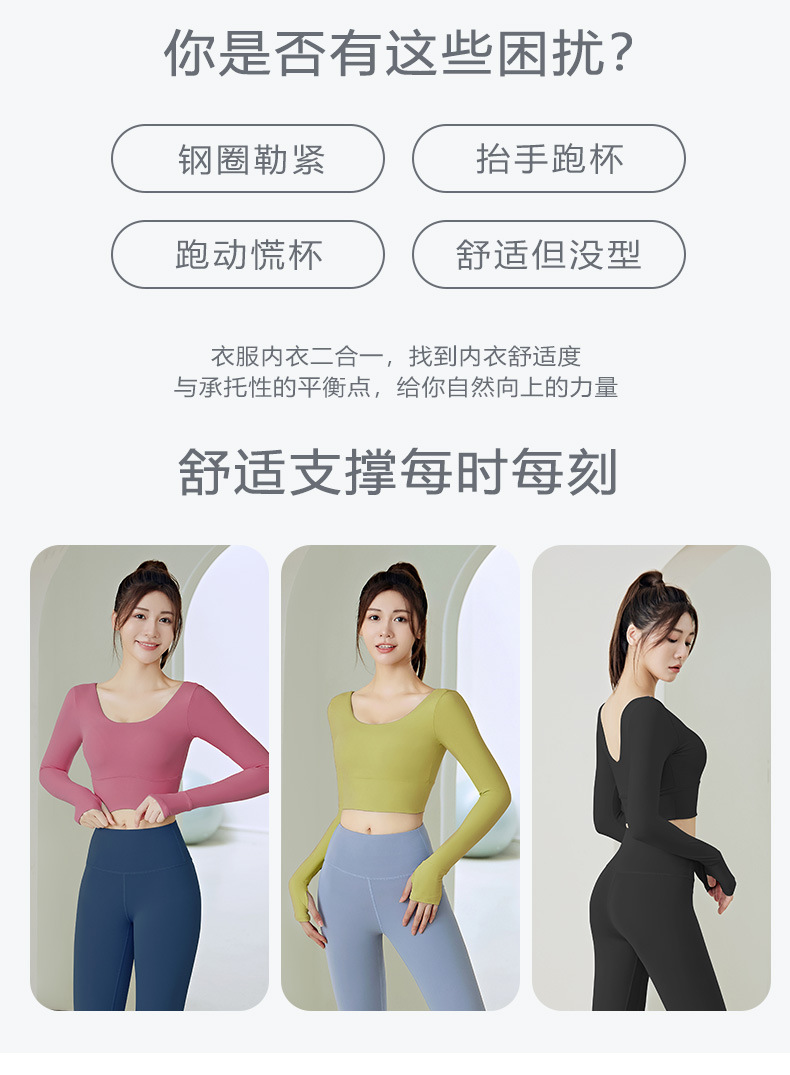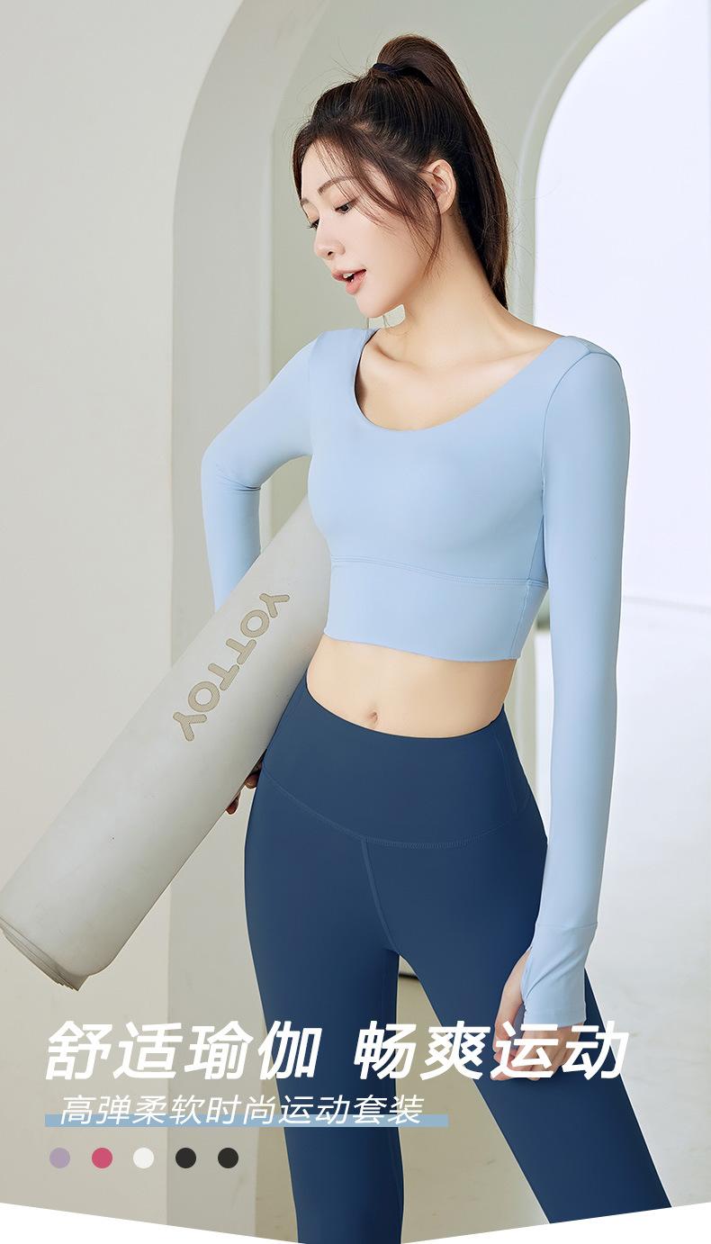 주이탕 단색 나일론 타이트핏 러닝 크롭탑 가슴 패드 내장 스포츠 피트니스 긴팔 요가복