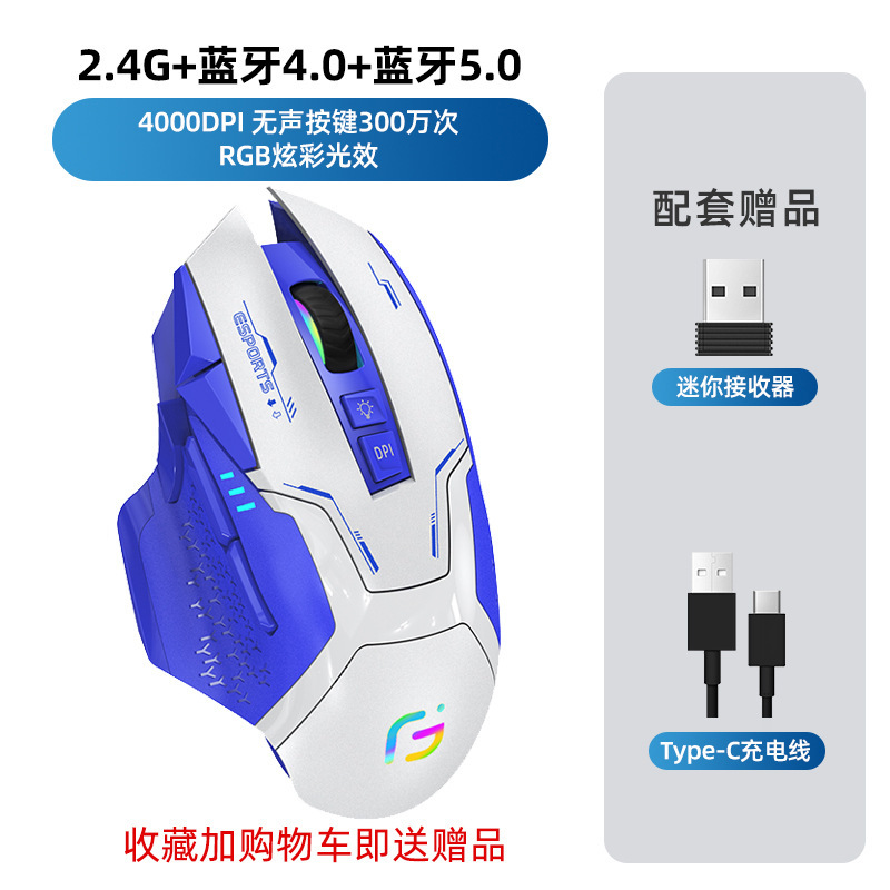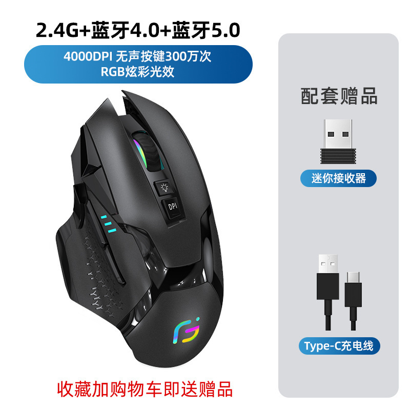 工厂源头,有研发团队,有创新思维,品质有保证 ,电竞版:是可以玩大型游戏都游戏,【什么是三模鼠标】一个鼠标有2.4G+蓝牙4.0+蓝牙5.0三种模式功能 一个鼠标可以控制三台电脑,非常方便,一个2.4G模式可以连一台电脑,蓝牙4.0模式可以连另一台电脑,蓝牙5.0还可以连一台电脑,只要拔动鼠标底部模式开关,就可以简单操作两台电脑。两台电脑一个鼠标就搞定。本店产品不包邮,因电子产品不能保证100%良品,支持七天无理由退换货,1年保修,运费买家自理,介意者勿拍。