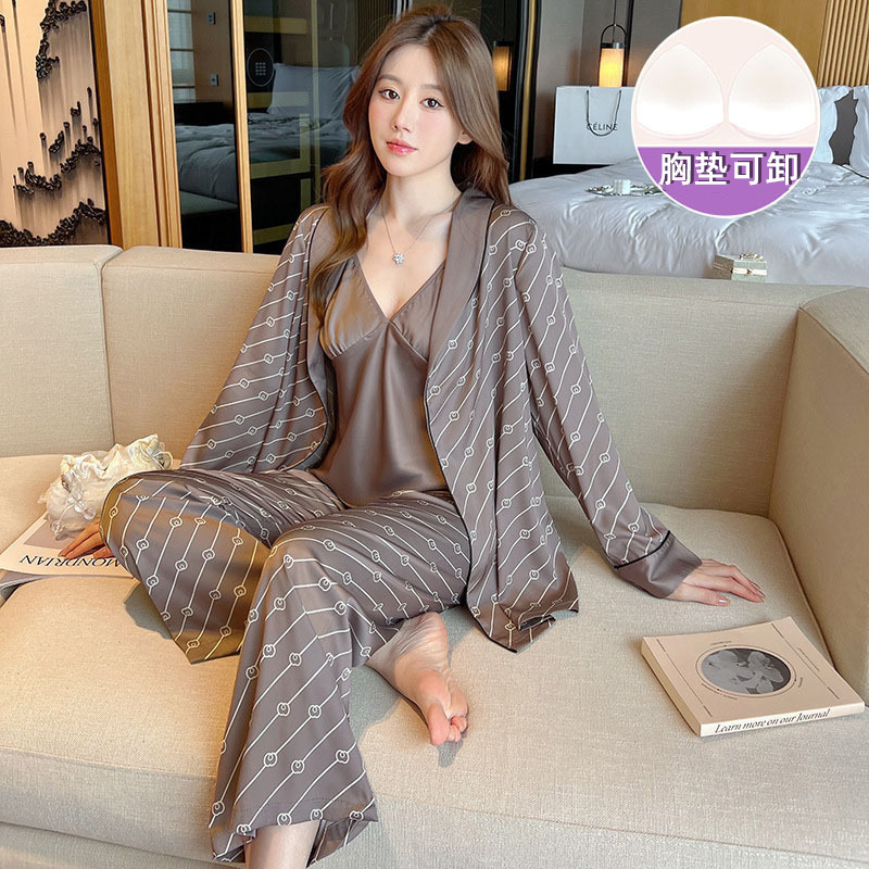[밀크 브루 커피] 아이스 실크 파자마 여성 봄과 여름 섹시한 3 피스 세트 하이 엔드 전국 패션 새로운 중국 홈 의류 가을스토어 가기