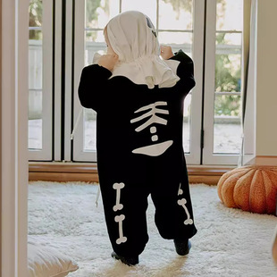 24万圣节婴儿服装ins款小骷髅印花连体衣宝宝节日礼服长袖套装