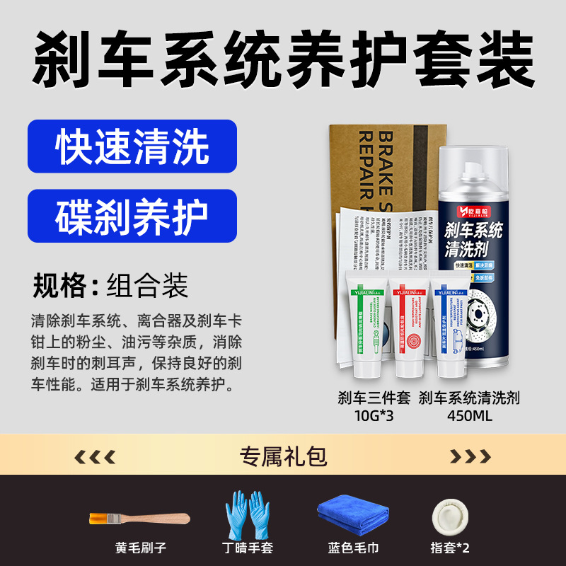 • 브레이크 유지 관리 3종 세트 - 10g + 브레이크 시스템 클리너 - 450ML - 7색 (파란색 수건 + 흰색 브러시 + 일회용 장갑 포함)