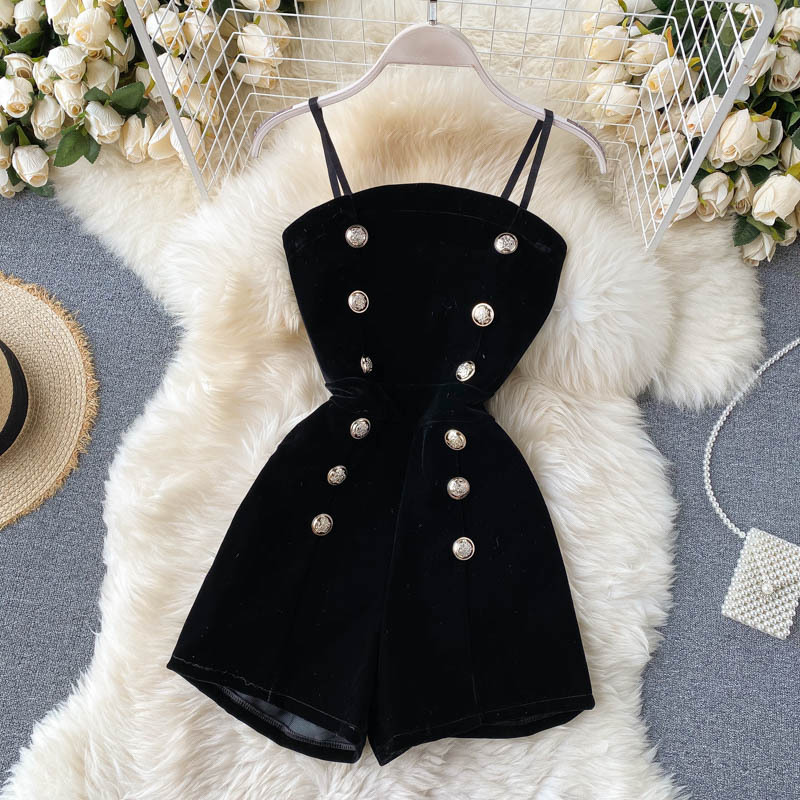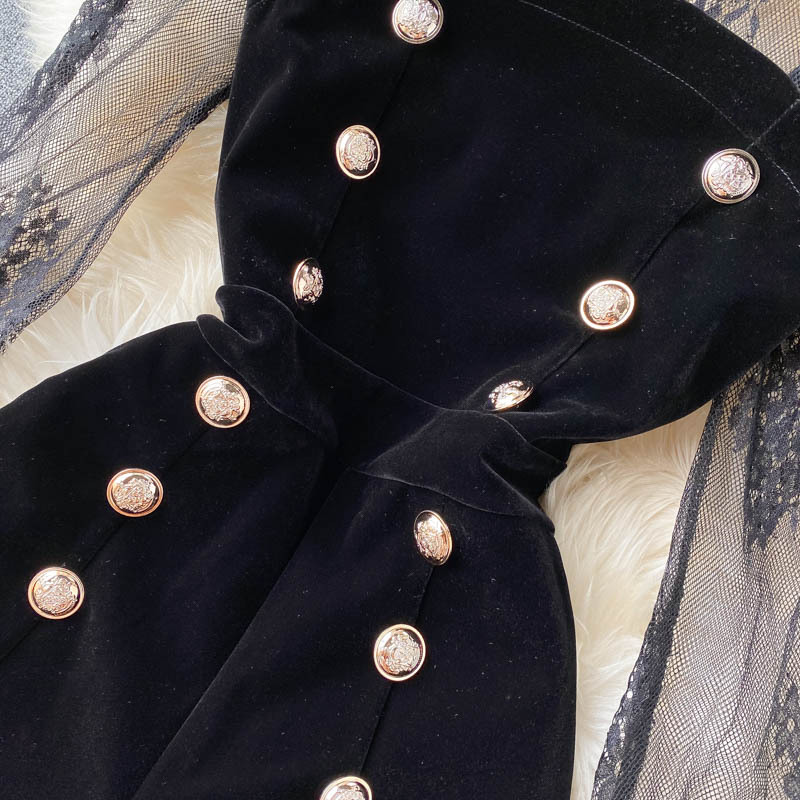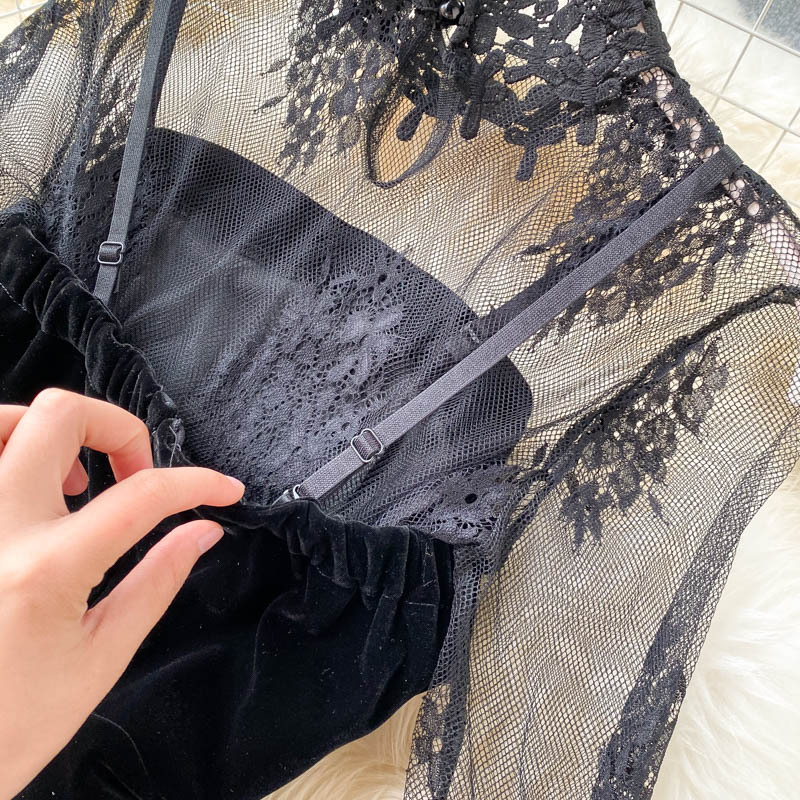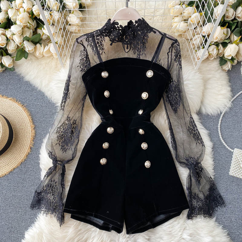 한국 가을 신상품 빛 성숙한 스타일 메쉬 레이스 섹시한 탑 여성용 더블 브레스트 스트랩 와이드 레그 점프 슈트 세트스토어 가기