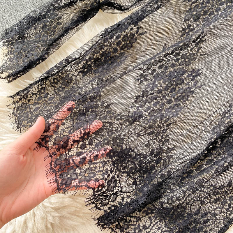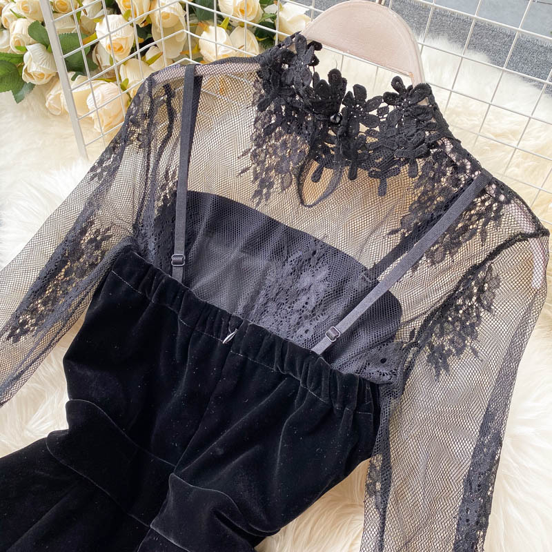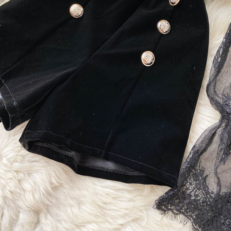 한국 가을 신상품 빛 성숙한 스타일 메쉬 레이스 섹시한 탑 여성용 더블 브레스트 스트랩 와이드 레그 점프 슈트 세트