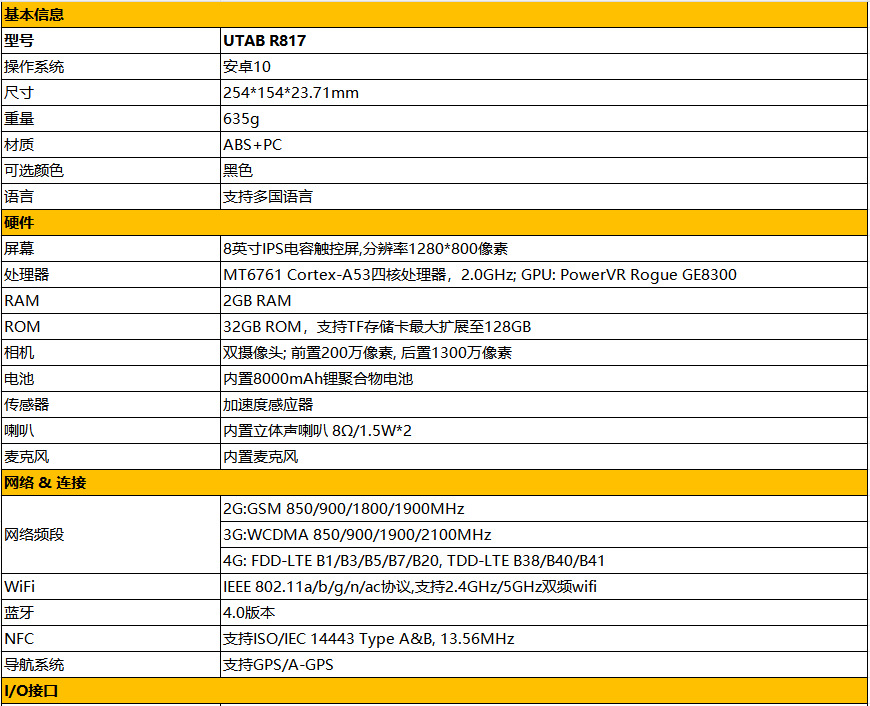 UTAB R817 8 英寸安卓4G 工业平板电脑,带前置 NFC 读卡器