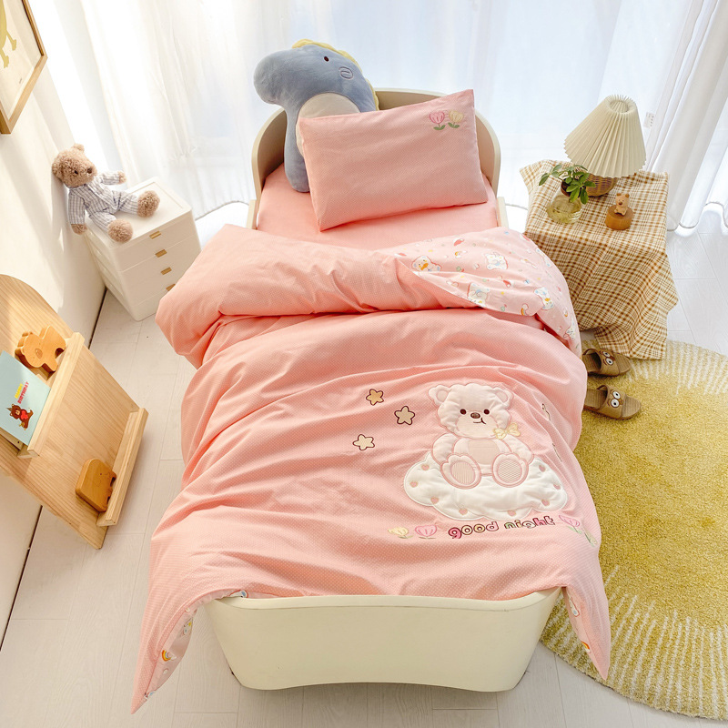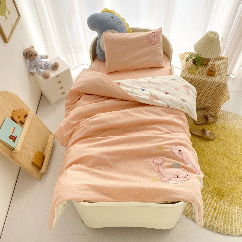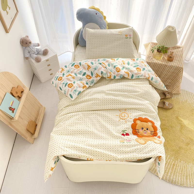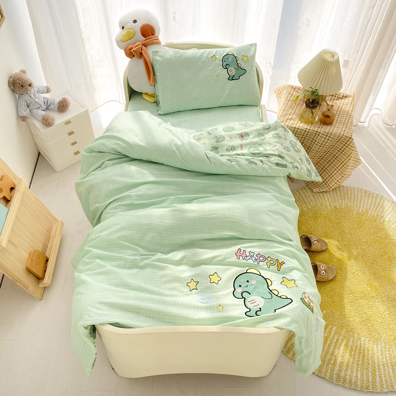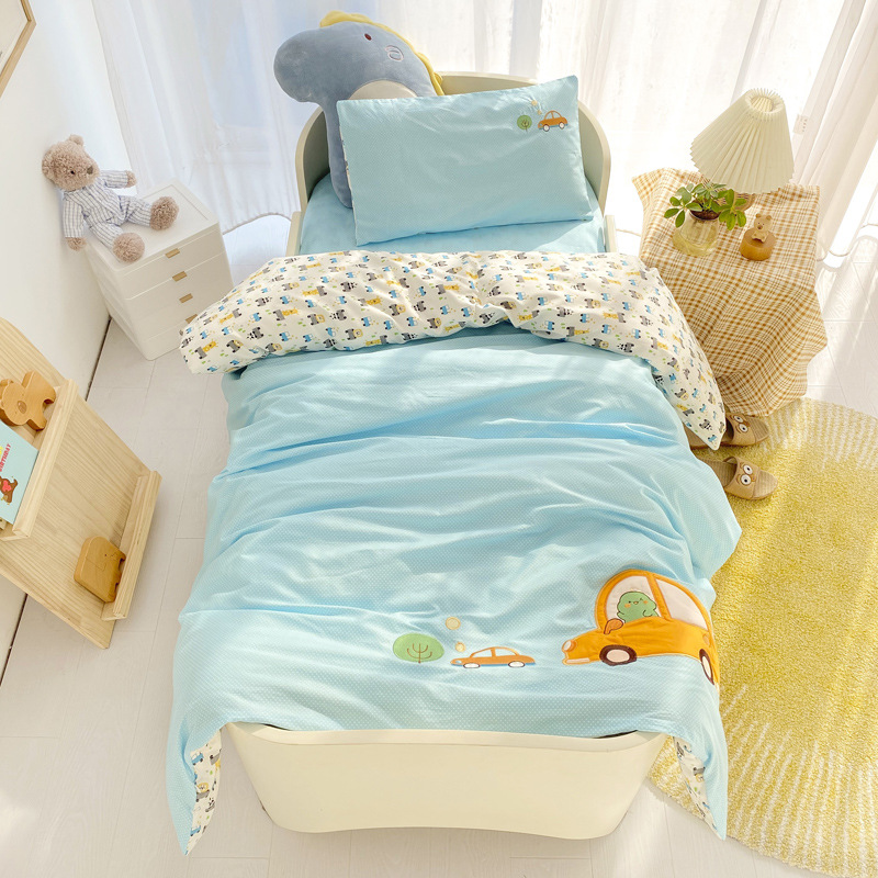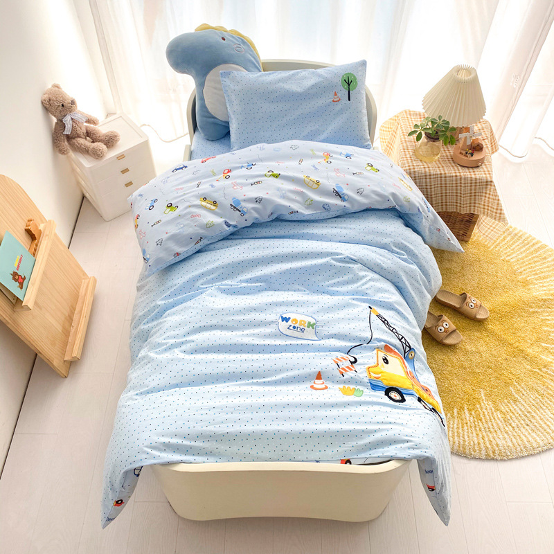 本系列套件采用的是全棉A类面料,在生产儿童套件中,窄幅面料属于较好的面料!不掉色,不起球,全棉加密面料、缩水率低。现在市面上出现很多相同花色的套件价位比较低,很多客户会觉得我们的价格高了,其实您买到后对比就一目了然了,市面上低价位的套件面料是12868的,涂料印染,洗后缩水严重,面料稀疏,容易掉色,丝绵芯也不是整张羽丝棉填充、棉花芯也不是正宗的新疆棉,偷工减料,故成本低了,价位也就低了。所以无论是幼儿园托儿所还是宝妈们,购买前一定要注意了,选择孩子的床品,质量选择要慎重!!