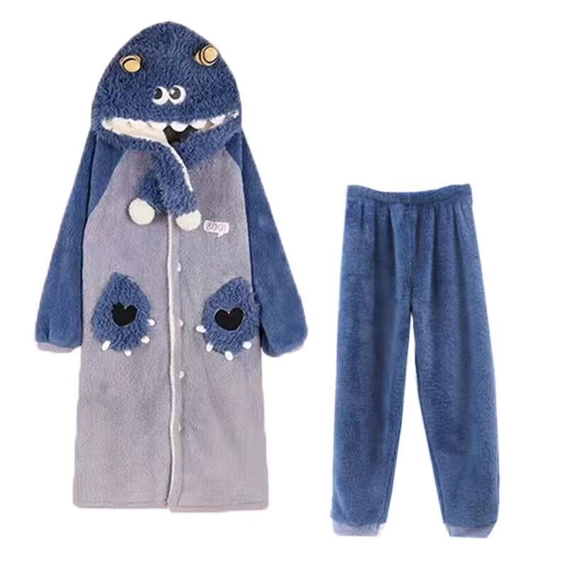 작은 괴물 산호 양털 두꺼운 잠옷 여자의 가을과 겨울 만화 귀여운 남자의 여분 긴 플란넬 목욕 가운 잠옷