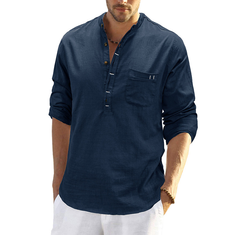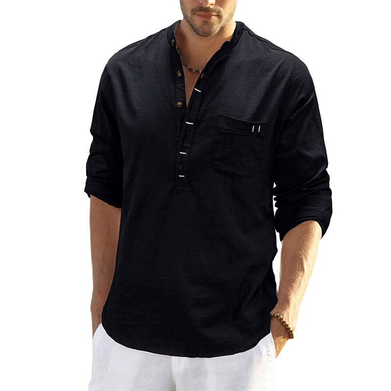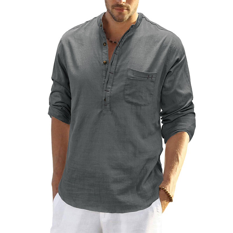 유럽과 미국 봄 크로스 보더 남성용 헨리 린넨 단색 패치 가방 긴 소매 셔츠 대외 무역 남성 헨리 캐주얼 탑