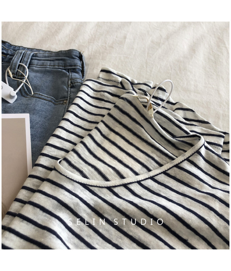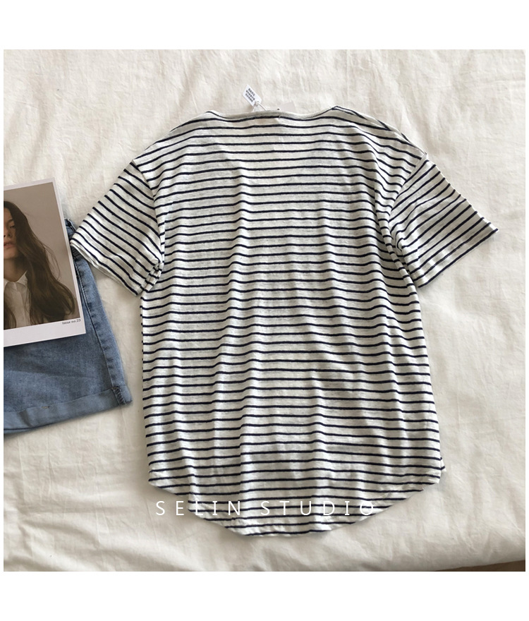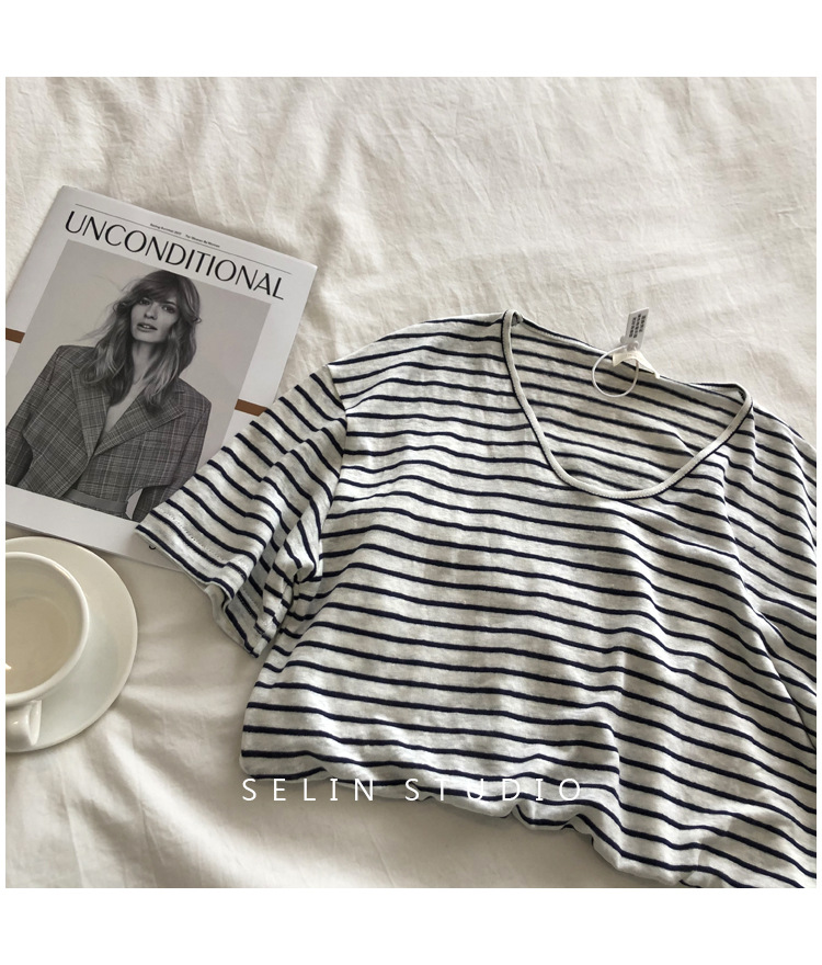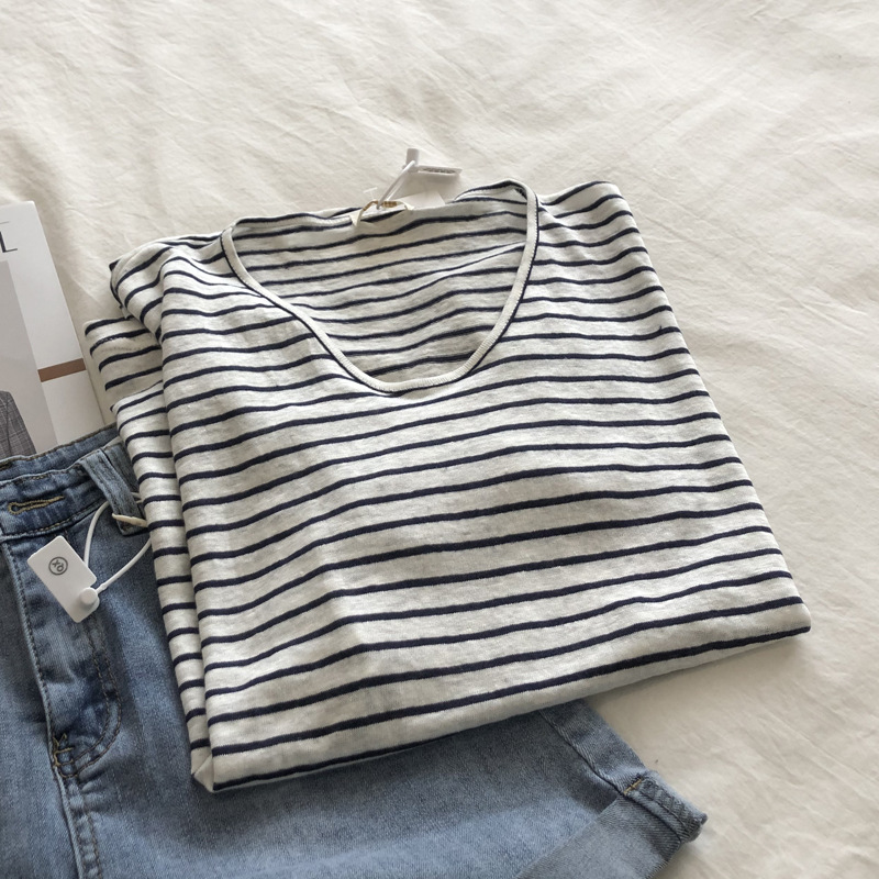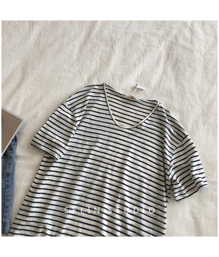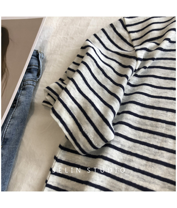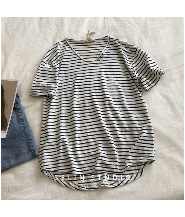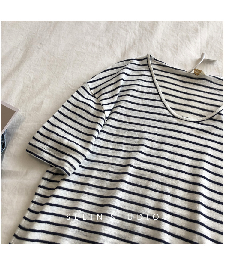 상쾌한 통기성 복고풍 시대-느슨한 게으른 린넨 코튼 스트라이프 라운드 넥 짧은 소매 티셔츠 여성의 다재다능한 슬리밍 탑 여름