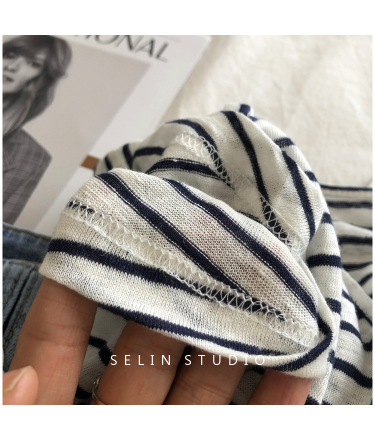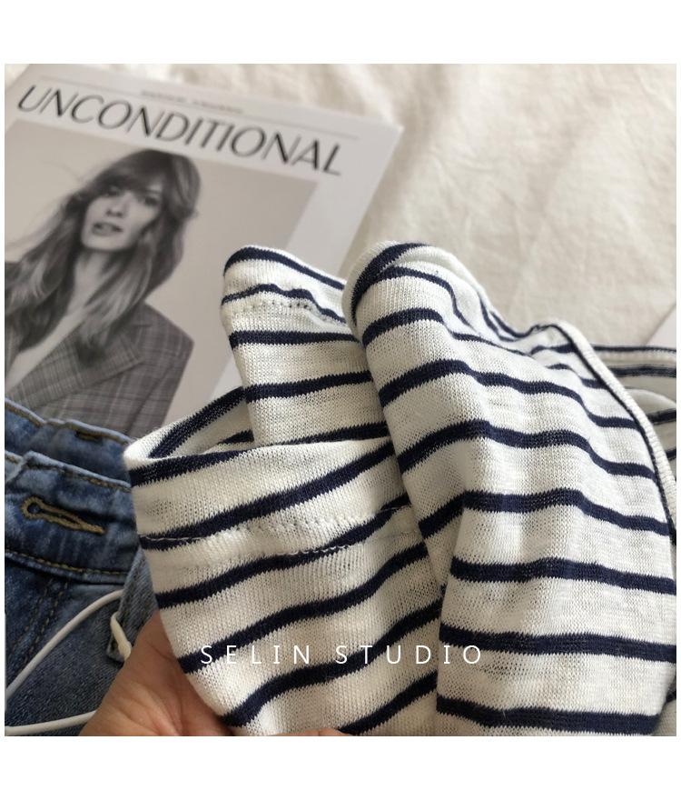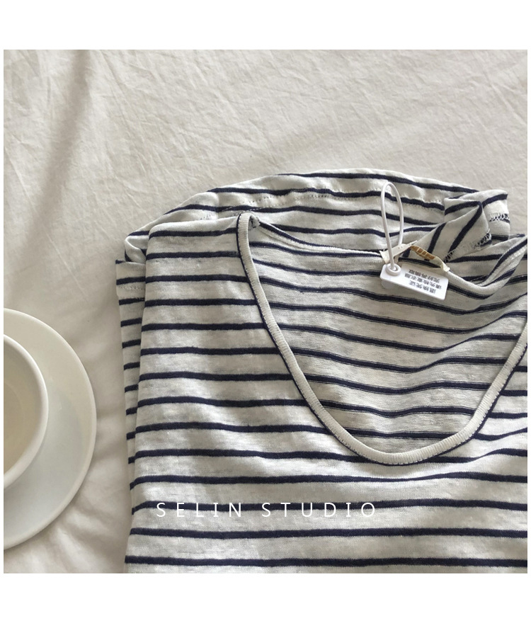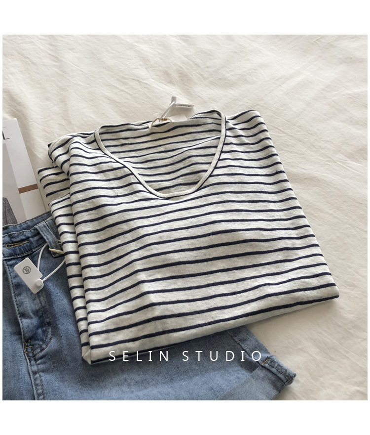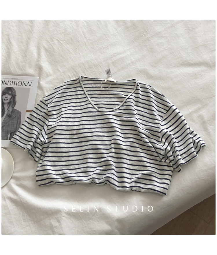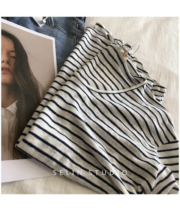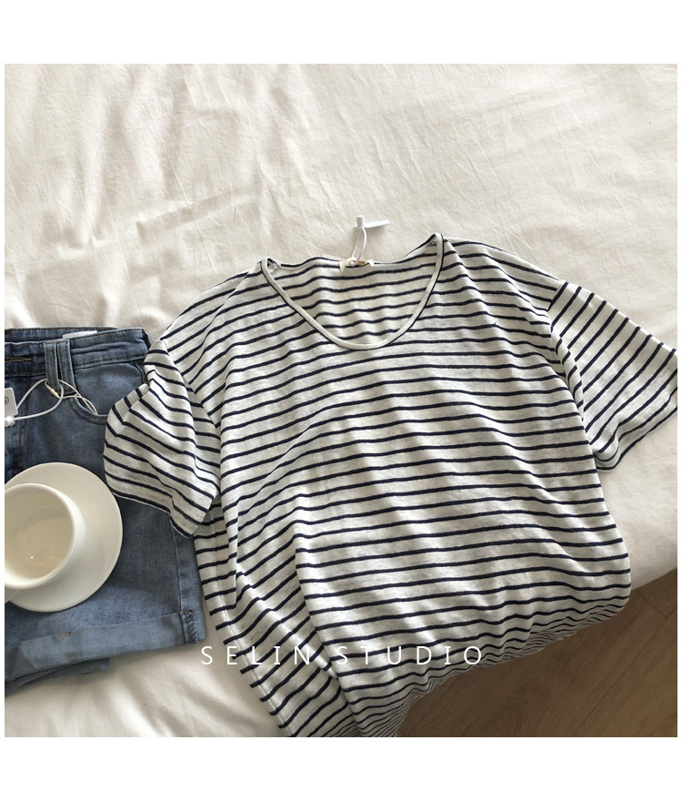 상쾌한 통기성 복고풍 시대-느슨한 게으른 린넨 코튼 스트라이프 라운드 넥 짧은 소매 티셔츠 여성의 다재다능한 슬리밍 탑 여름