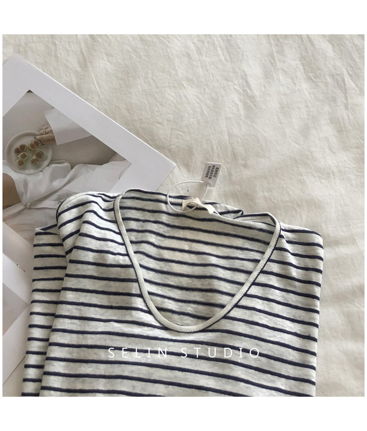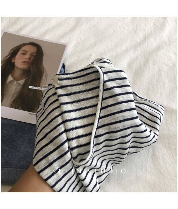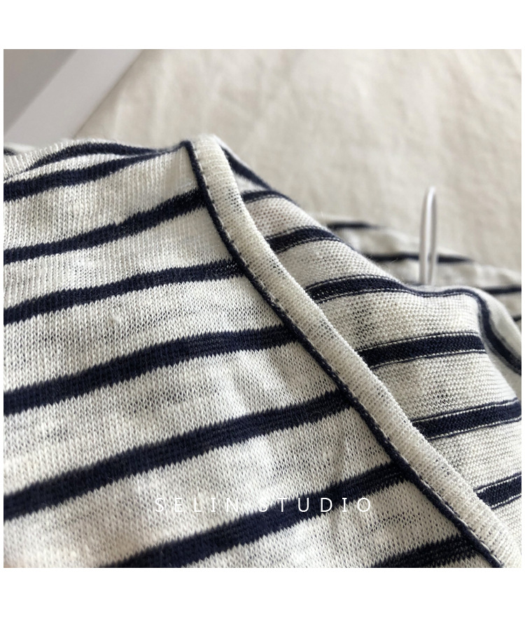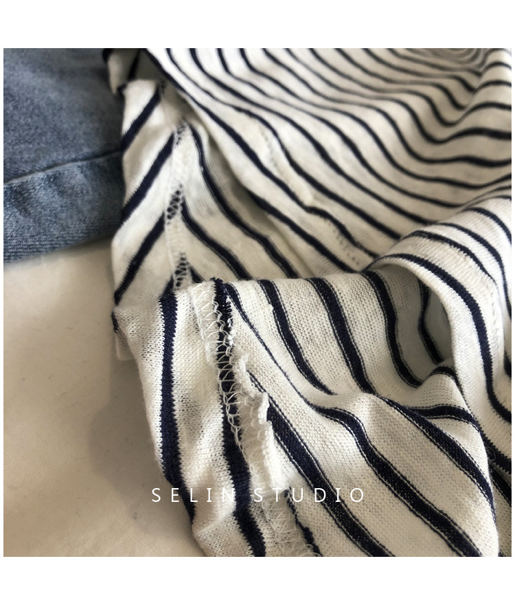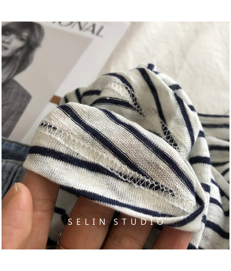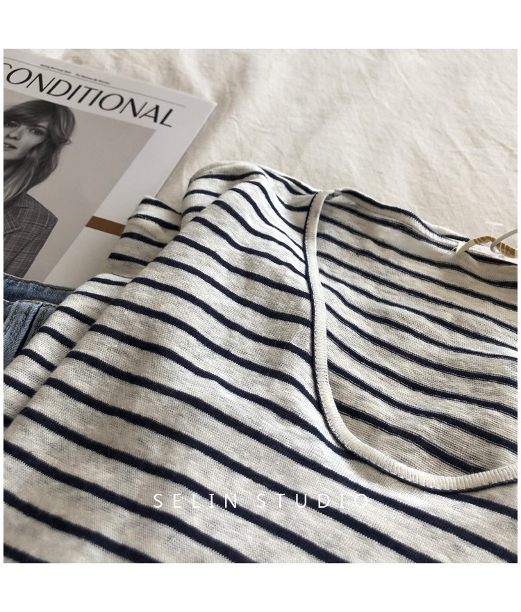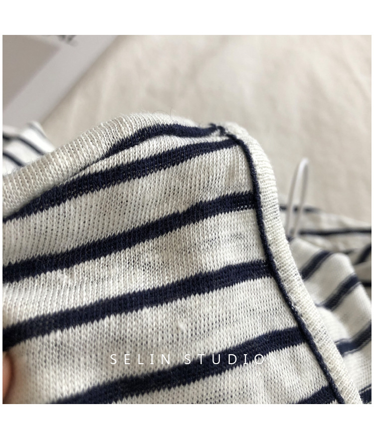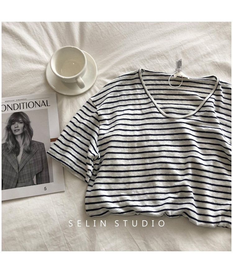 상쾌한 통기성 복고풍 시대-느슨한 게으른 린넨 코튼 스트라이프 라운드 넥 짧은 소매 티셔츠 여성의 다재다능한 슬리밍 탑 여름